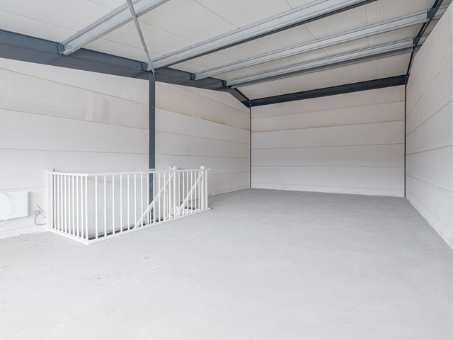 Toegang tot de ruimte via de (loop)deur of de hand bedienbare overheaddeur. De verdieping meet in totaal ca. 61m2. heeft een hoogte van 3,60 meter en uitgevoerd met een keurig toilet. Het toilet is in zijn geheel betegeld met een witte wandtegel, een antracietkleurige vloertegel en is uitgevoerd met een hangend toilet, fonteintje en inbouwspots.