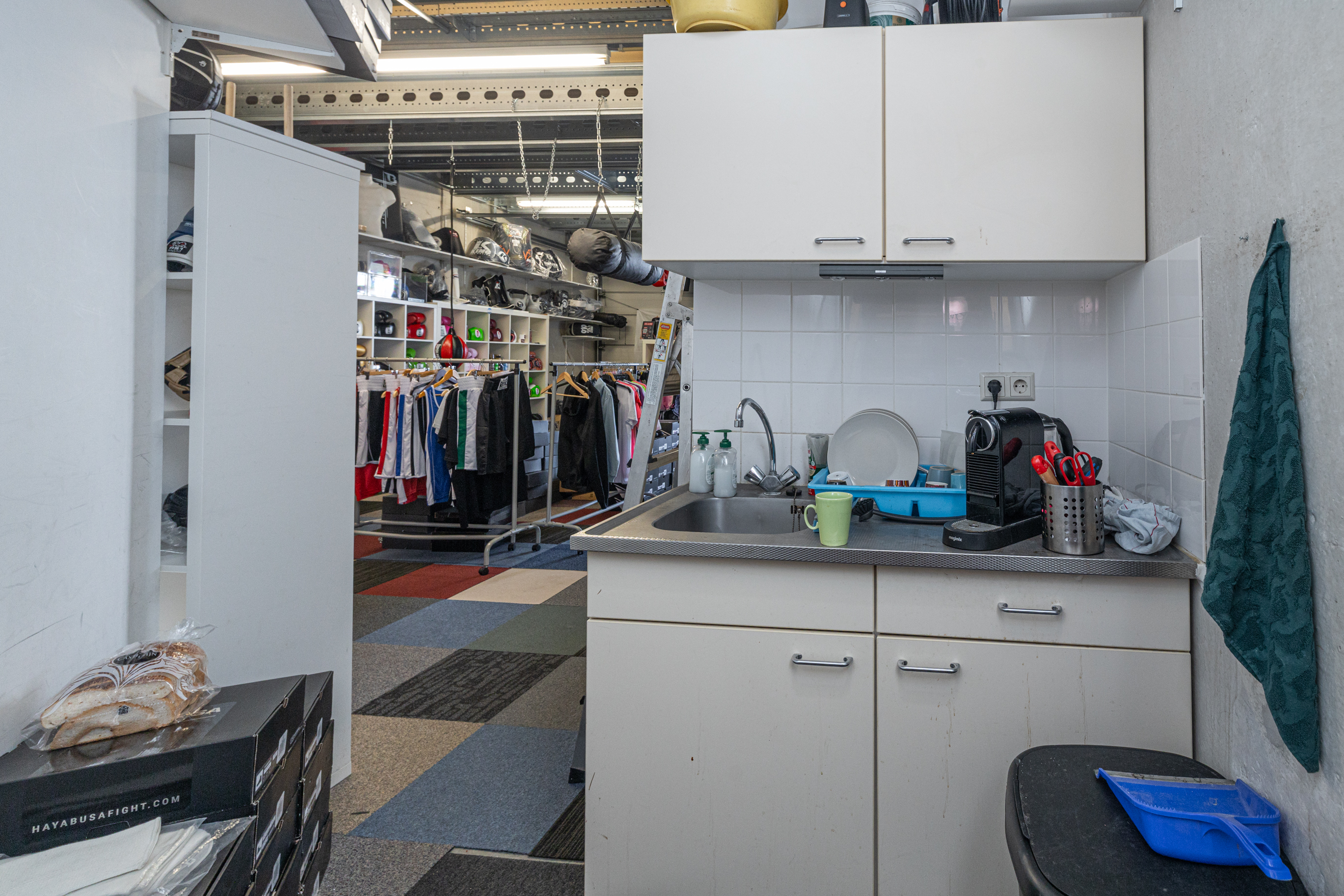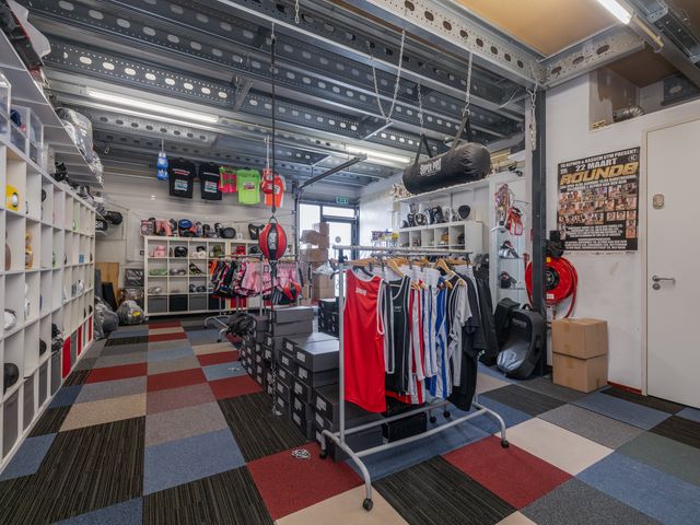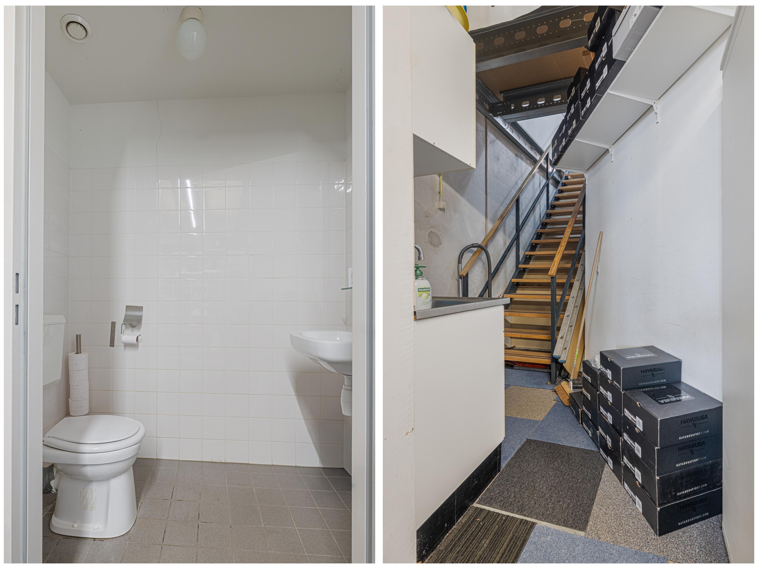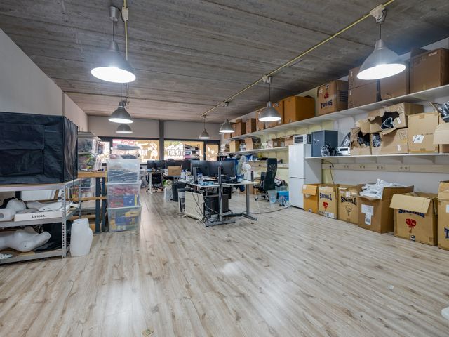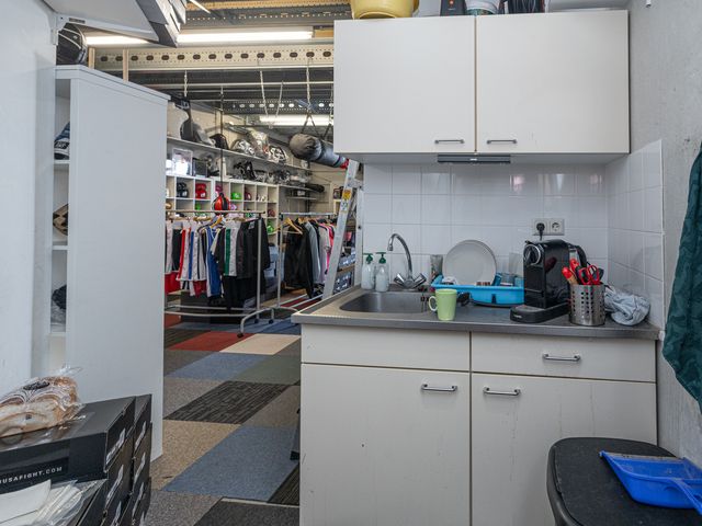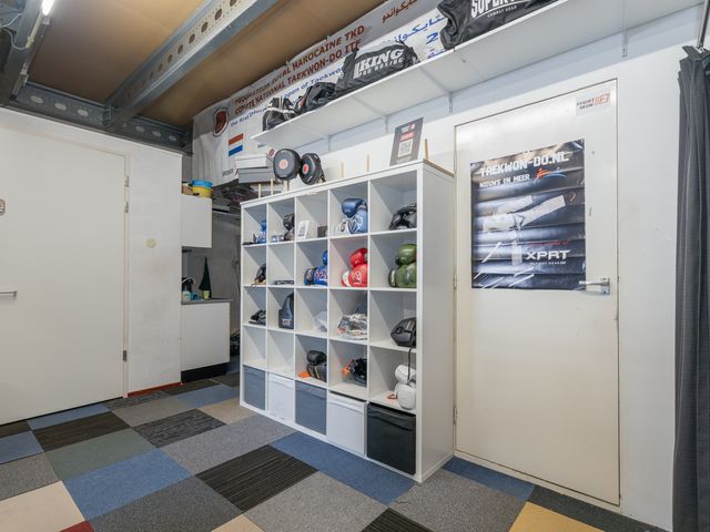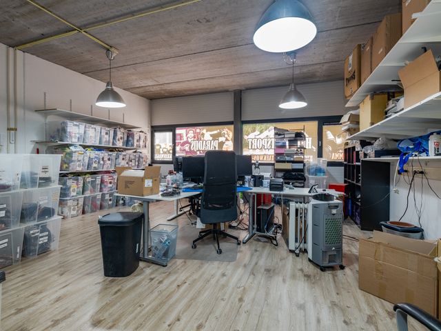 Binnenkomst via de loopdeur of de overheaddeur. De ruimte aan de voorzijde is ca. 52m2 en heeft eveneens toegang tot het toilet en de pantry. Het toilet is in zijn geheel betegeld en voorzien van een fonteintje. Toegang tot de ruimte aan de achterzijde middels een deur. Ca. 50m2 met veel lichtinval door de grote raampartij aan de achterzijde.