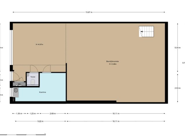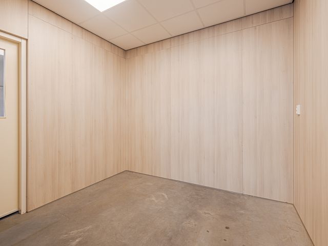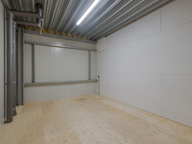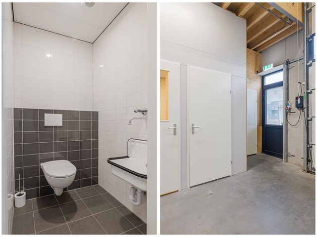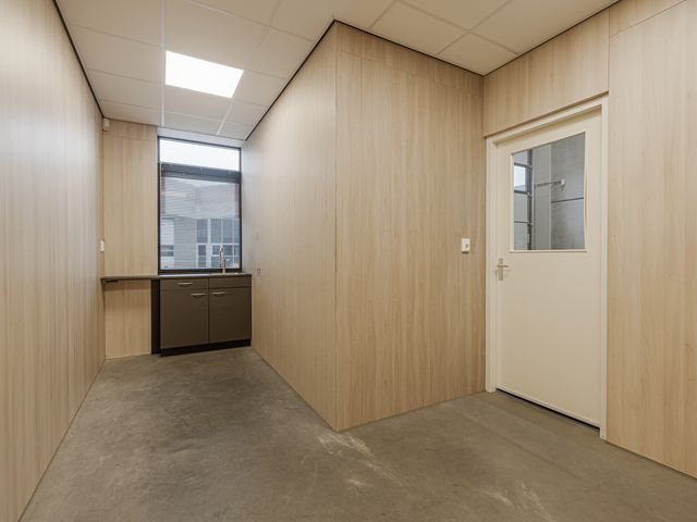 Binnenkomst in de bedrijfshal met toegang tot het toilet en de kantine met pantry. Het totale oppervlak beslaat ca. 125m2. Het toilet is in zijn geheel betegeld en voorzien van een hangend toilet en een uitstortgootsteen. De kantine is ca. 12m2 en is gelegen aan de voorzijde van het pand. Keurige afwerking met wandpanelen met houtlook en tevens voorzien van led verlichting. De pantry is gelegen onder het raam en is uitgevoerd met een boiler.