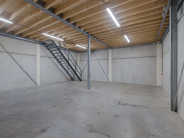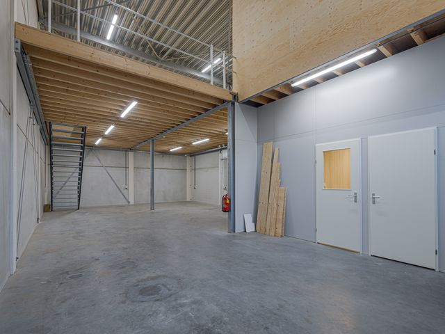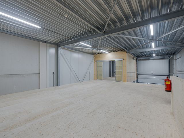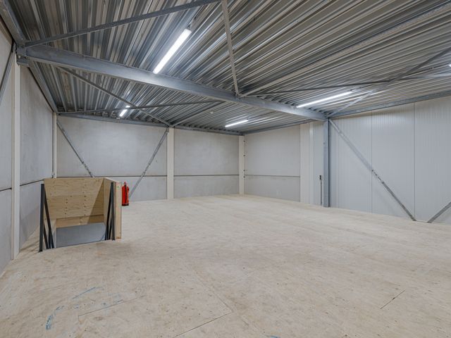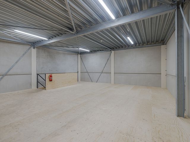 De bedrijfshal beslaat ca. 109m2. Het voorste deel staat in open verbinding met de eerste verdieping en heeft een hoogte van ca. 7 meter. Hierdoor is het mogelijk om goederen naar boven te verplaatsen en op te slaan. Onder de verdiepingsvloer meet de hoogte ca. 3,50 meter. Rondom stopcontacten en tevens krachtstroom aansluitingen. Middels een stalen trap toegang tot de 1e verdieping.
