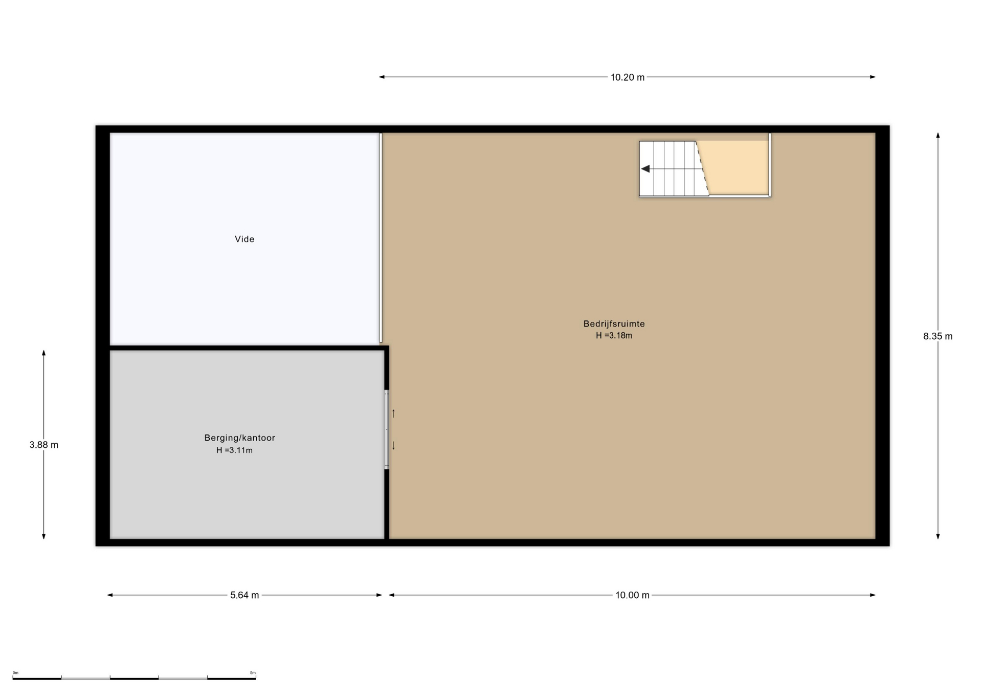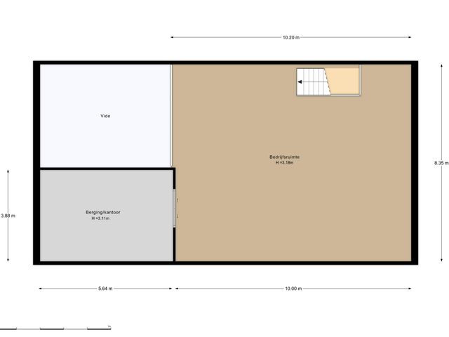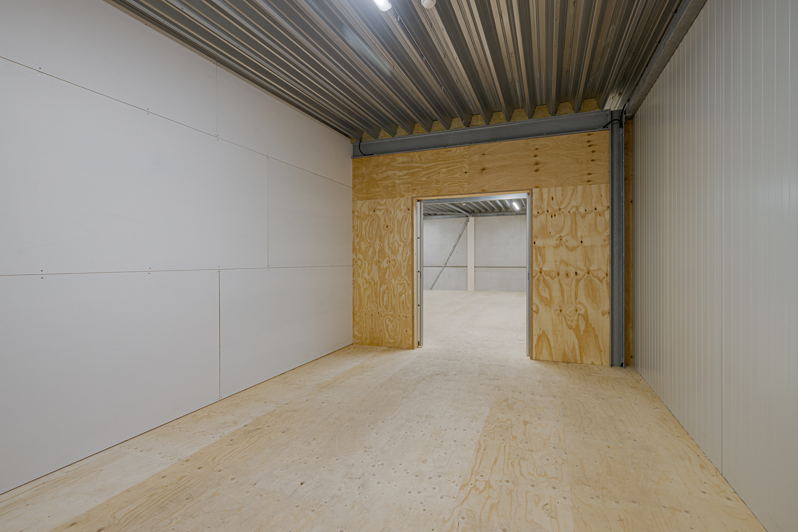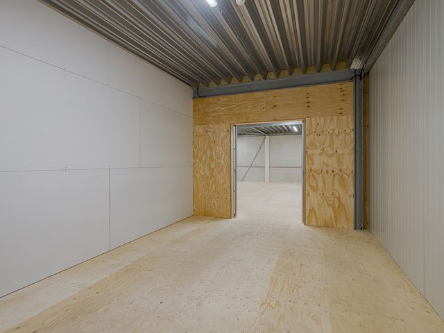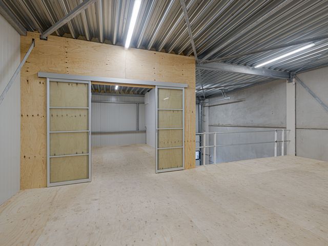 Open ruimte van ca. 80m2 met diverse stopcontacten rondom. Hoogte tot aan het plafond is ca. 3,18m. Via de vide is het mogelijk om goederen middels een vorkheftruck naar boven te brengen. Aan de voorzijde een aparte kantoorruimte van ca. 22m2. Deze ruimte is af te sluiten middels schuifdeuren.
