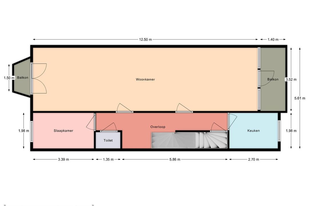 Overloop met garderobe en toegang tot de vertrekken. Royale woonkamer van maar liefst 44m2, met zowel balkon aan de voorzijde als aan de achterzijde. Dichte keuken gelegen aan de achterzijde en voorzien van kookplaat, afzuigkap, vaatwasser, koelkast, oven en magnetron. Slaapkamer I (kleinste slaapkamer van de woning) van ca. 7m2). Hangend volledig betegeld toilet met fonteintje.