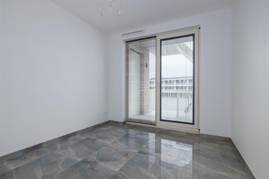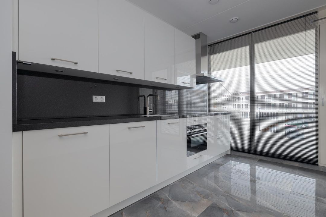 Toegang tot de woonkamer, gelegen is aan de achterzijde van de woning. Een heerlijke lichte ruimte dankzij de vele Franse balkons, met uitzicht op de winkels. Vanuit de woonkamer is de luxe open keuken te bereiken. De keuken is uitgevoerd in wit met een zwart blad. Deze is voorzien van een kookplaat met afzuigkap, vaatwasser, een combi-oven en een vrijstaande koel-/vriescombinatie. Vanuit de woonkamer is tevens de tweede slaapkamer te bereiken van circa 13m2. Ook deze kamer is voorzien van een grote raampartij welke uitkijkt op de winkels.