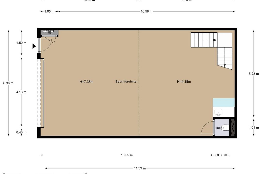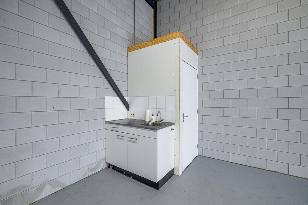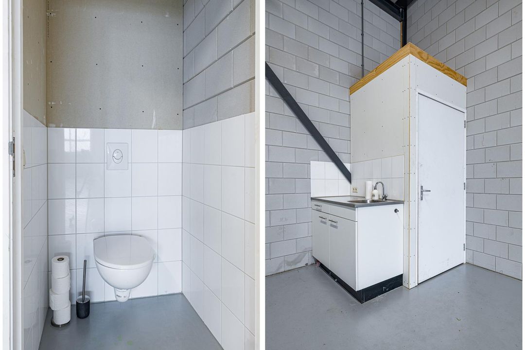 Bedrijfshal van ca. 72m2 met pantry, toilet en trap naar 1e verdieping. De bedrijfshal is te bereiken via een loopdeur en overheaddeur. De overheaddeur is ca. 4 meter hoog en 4 meter breed.