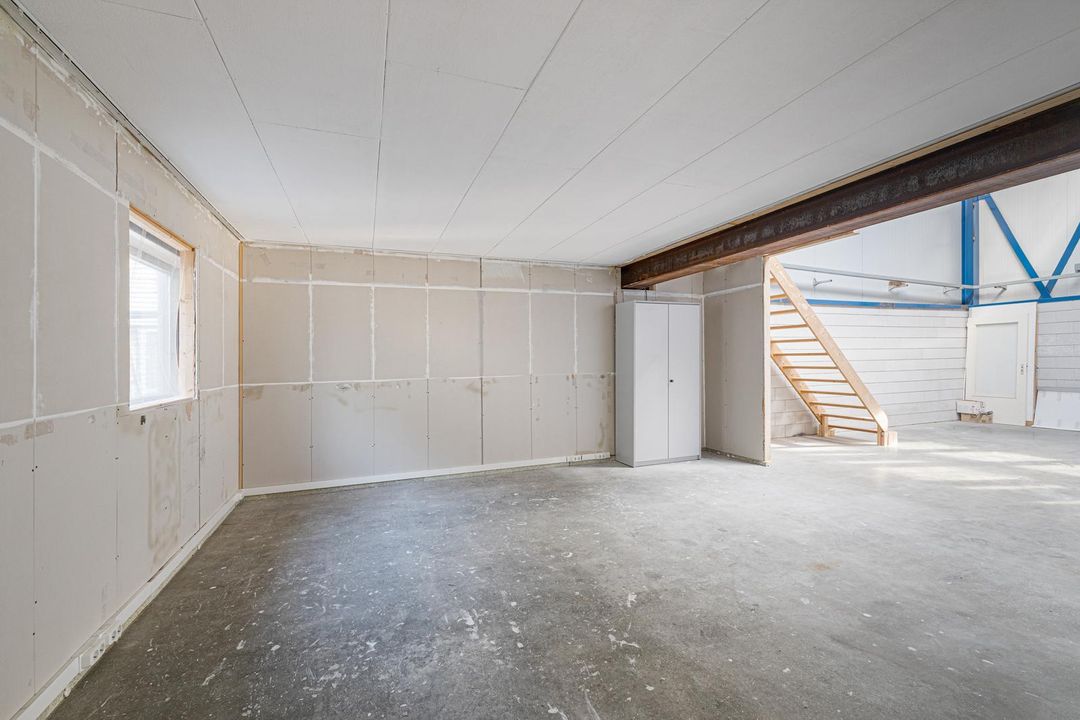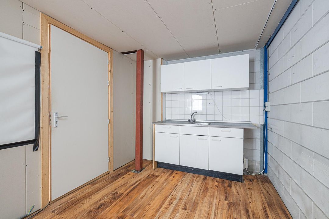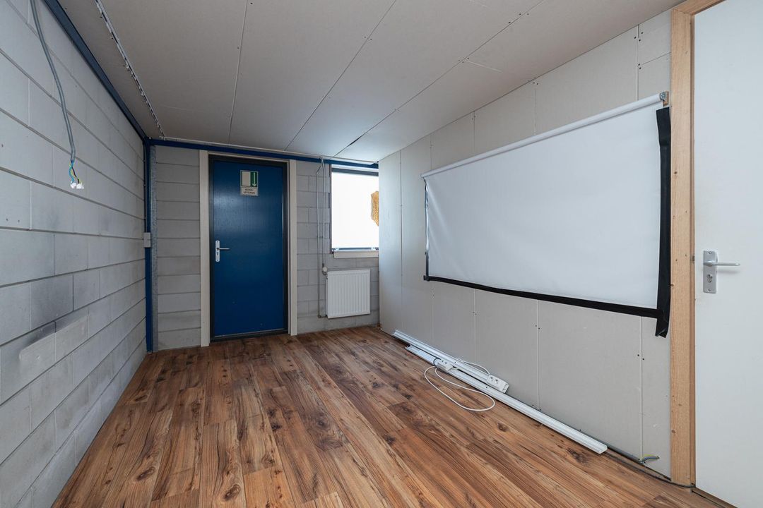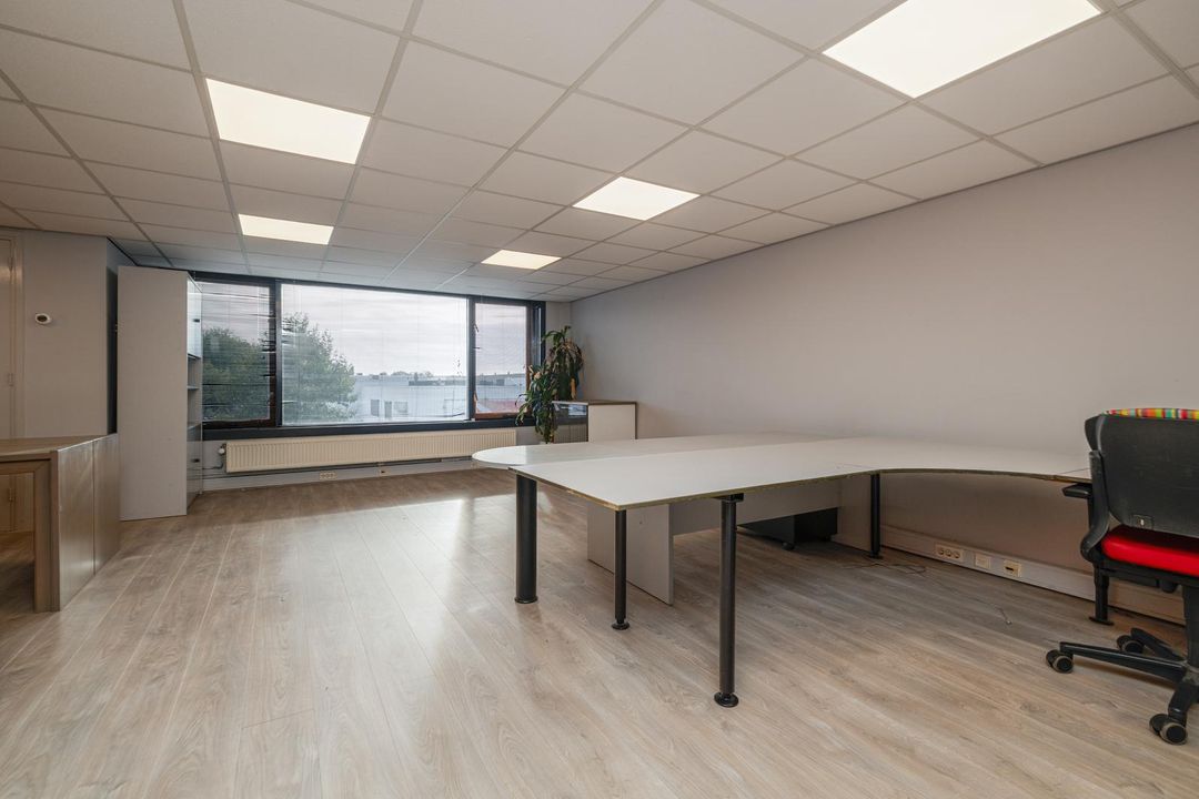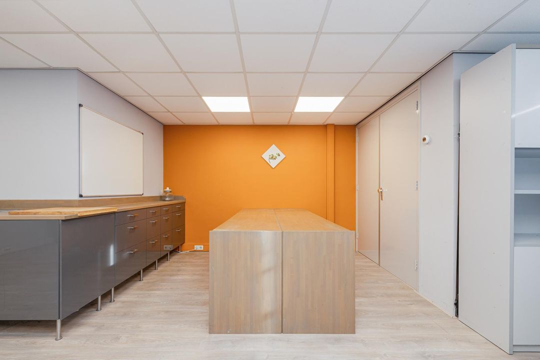 Via de trap toegang tot de kantoorruimte. Het kantoor meet ca. 40m2 en heeft een grote raampartij aan de voorzijde. Systeemplafond met led verlichting en een keukenblok uitgevoerd met een koelkast. De vloer is voorzien van een laminaatvloer.