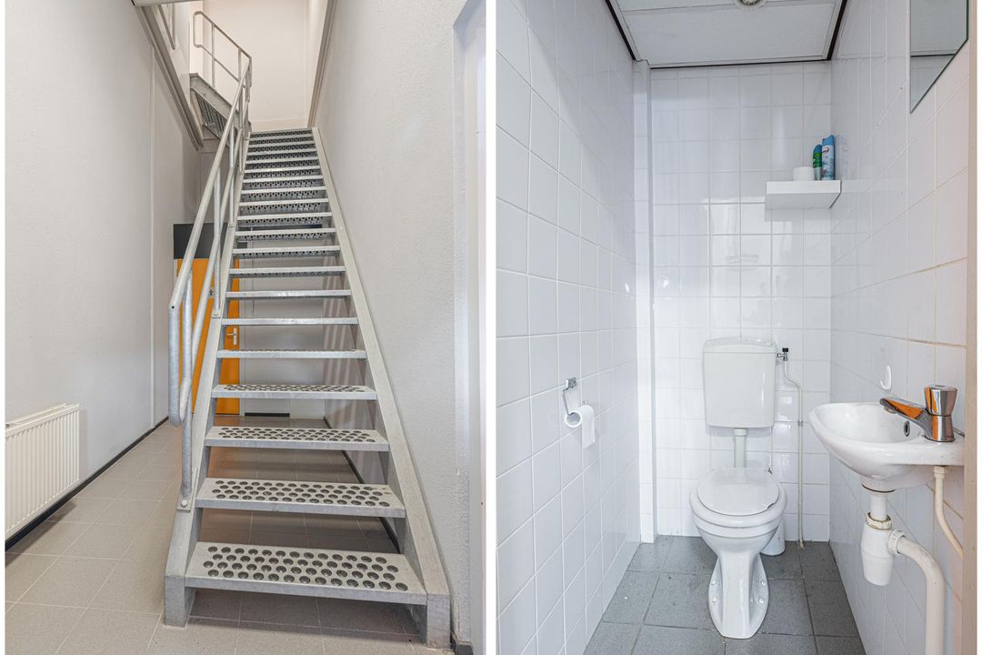 Entree in de hal met toegang tot de bedrijfshal, de eerste verdieping en een apart toilet. De lichte bedrijfshal heeft een grote lichtstraat en heeft een maximale hoogte van 6,74 meter. De hal is tevens toegankelijk via een elektrisch bedienbare overheaddeur. Vanuit de hal toegang tot de keuken/kantine van ca. 14m2. Tevens een apart toilet bereikbaar vanuit de hal.