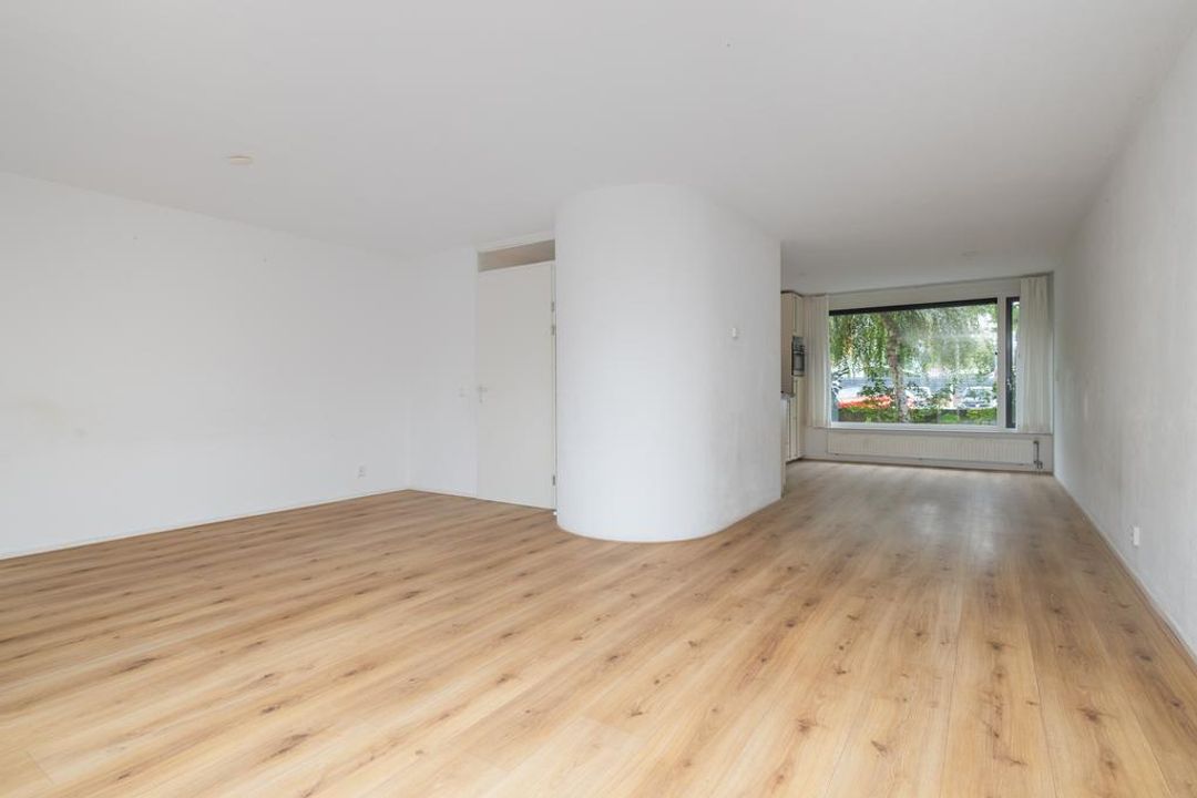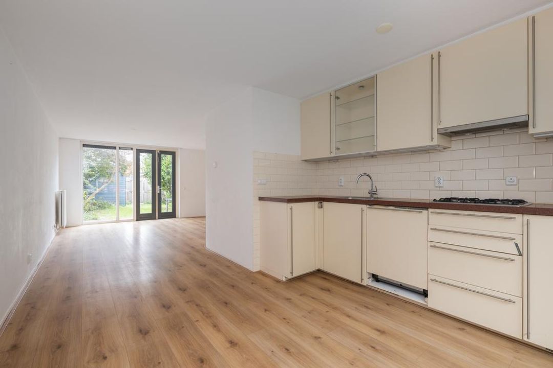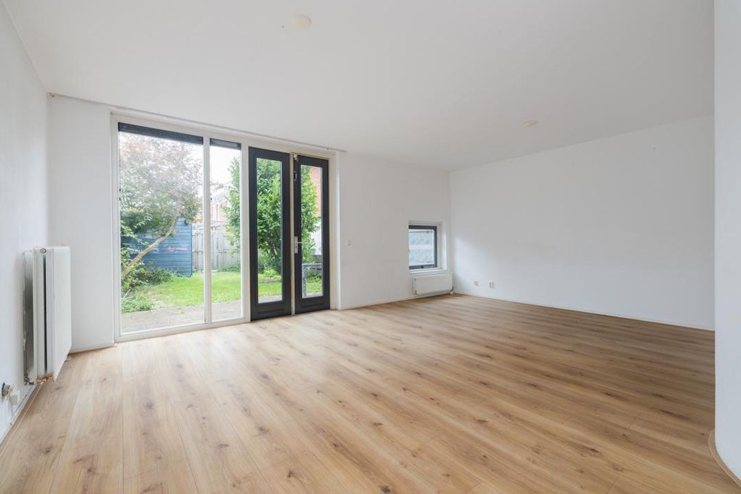 Ruime hal, betegeld hangend toilet met fonteintje en meterkast. Toegang tot de lichte en ruime woonkamer. Over de gehele breedte van de woonkamer raampartijen wat een gezellige, sfeervolle uitstraling geeft. Vanuit de woonkamer toegang tot de keuken uitgevoerd met inbouwapparatuur, o.a. koelkast, vriezer, gasfornuis met afzuigkap, vaatwasser, oven en magnetroncombinatie. Vanuit de woonkamer toegang tot de ruime en zonnige tuin met schuur en achterom. Opgang naar eerste verdieping.