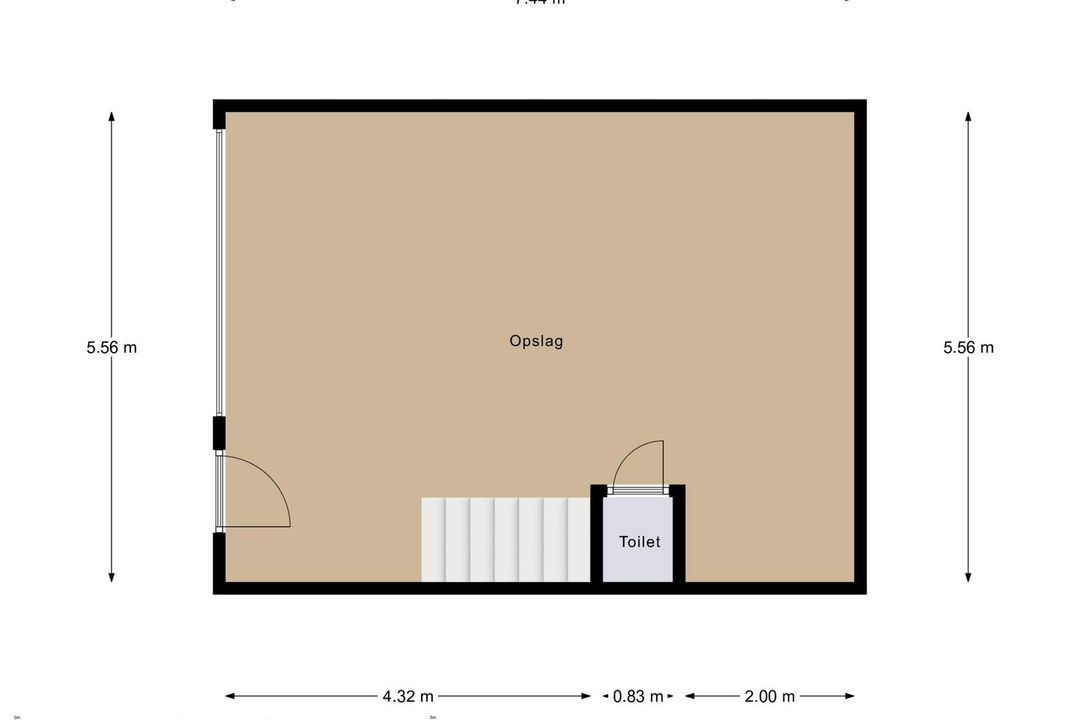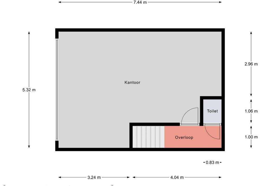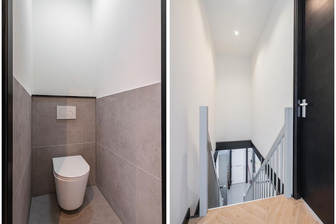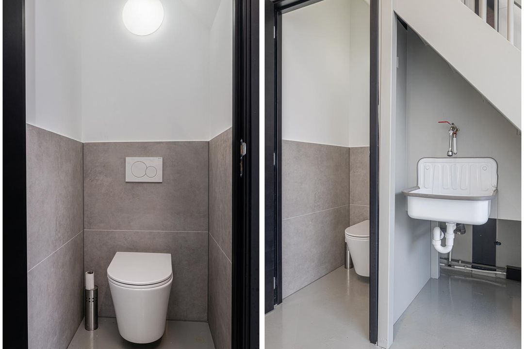 Overloop met toegang tot het toilet en de kantoorruimte. Het toilet is betegeld met een grijze vloer- en wandtegel en uitgevoerd met een hangend toilet. Diverse stopcontacten rondom zorgen er voor dat je door heel de hal heen werkzaamheden uit kan voeren waar stroom voor nodig is. Via de trap toegang tot de 1e verdieping.