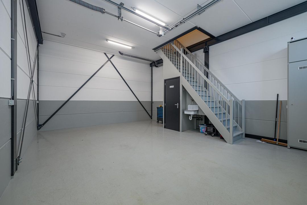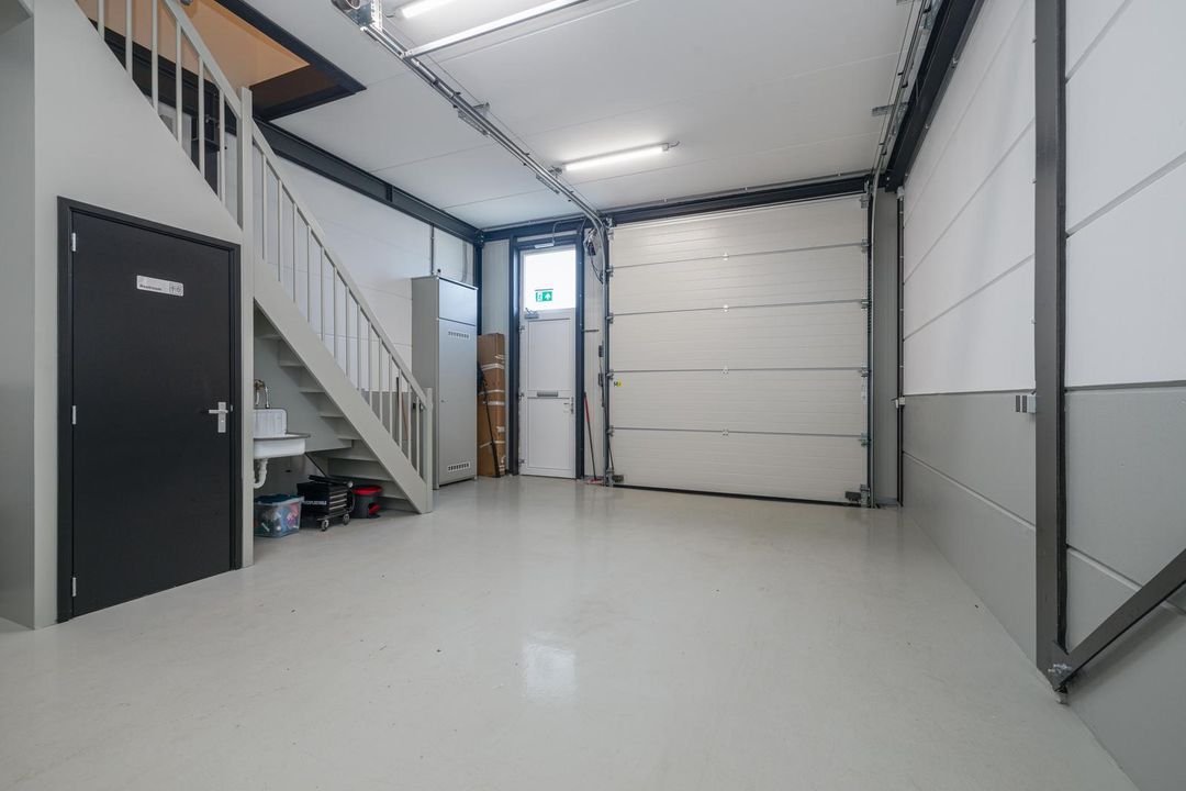 Binnenkomst in de hal van ca. 40m2 (VVO) via de loopdeur of de elektrisch bedienbare overheaddeur. De vloer is gecoat en de uitvoering bestaat uit ledverlichting, een luxe toilet, en een uitstort gootsteen. Via de trap toegang tot de eerste verdieping.
