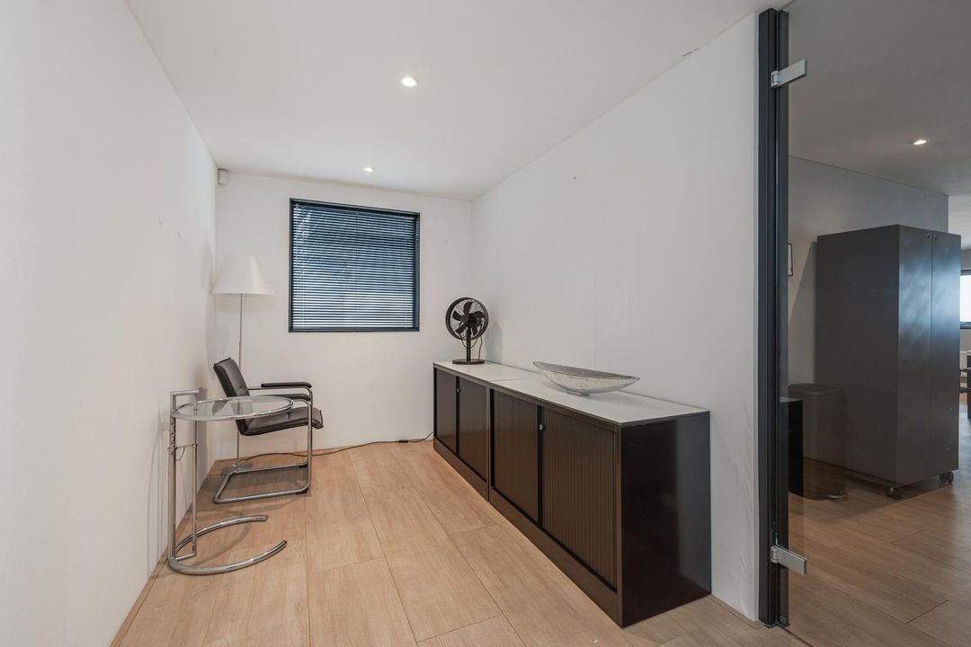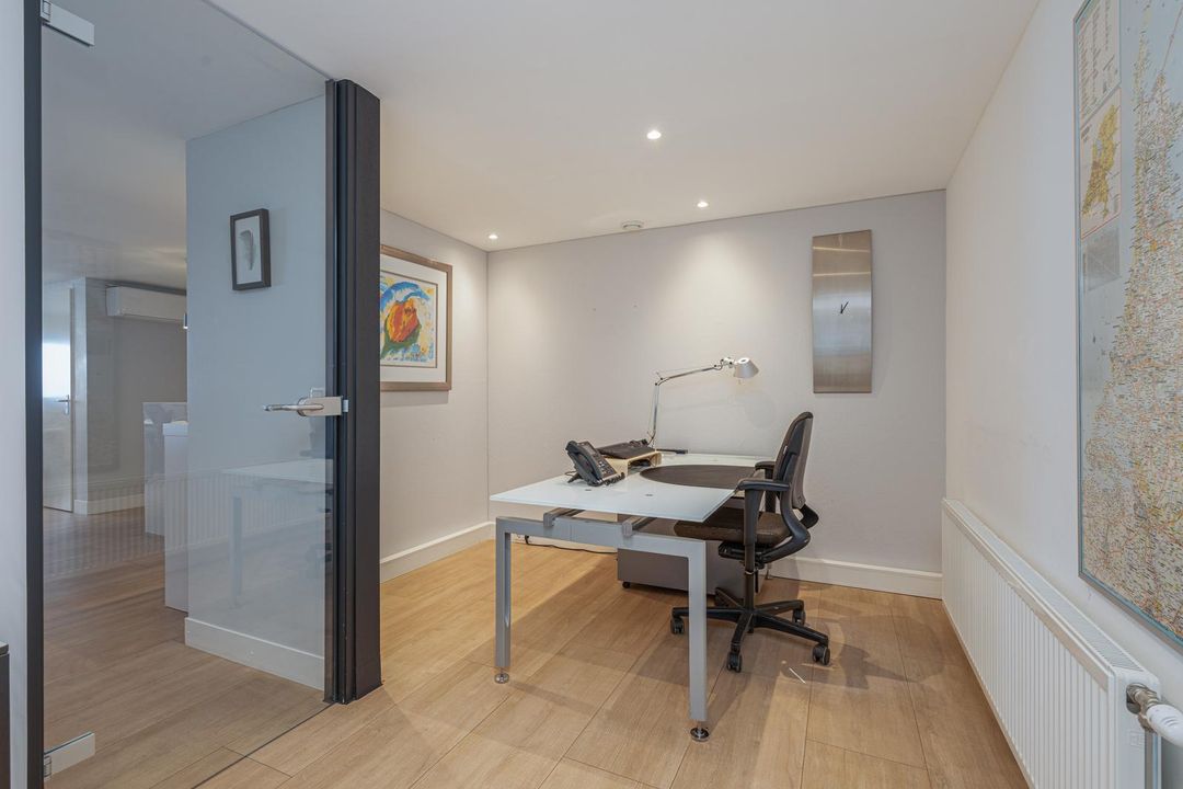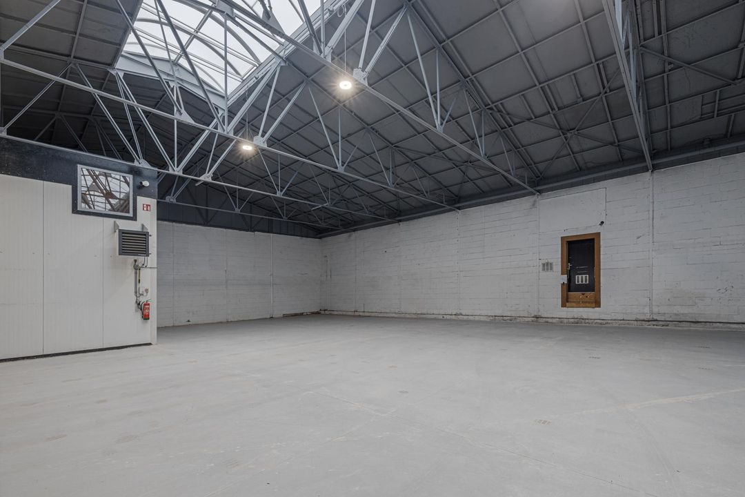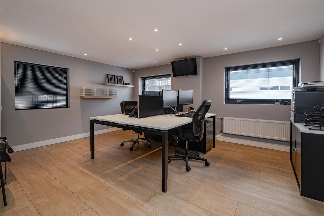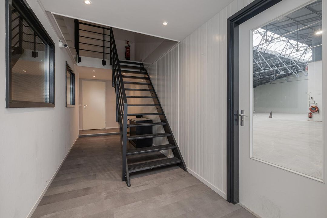 Landing with access to two offices of approx. 14 and 32 m². The 32 m² office is located at the front and has laminate flooring, recessed spotlights, radiators, air conditioning and a kitchen. There is also a storage room of approx. 3.5 m². The office of approx. 14 m² is accessible through a glass door and also has neat laminate flooring and a window overlooking the industrial hall.