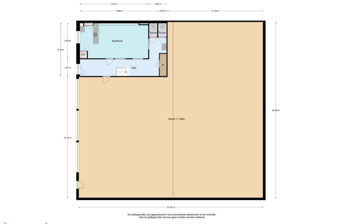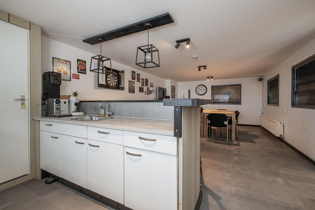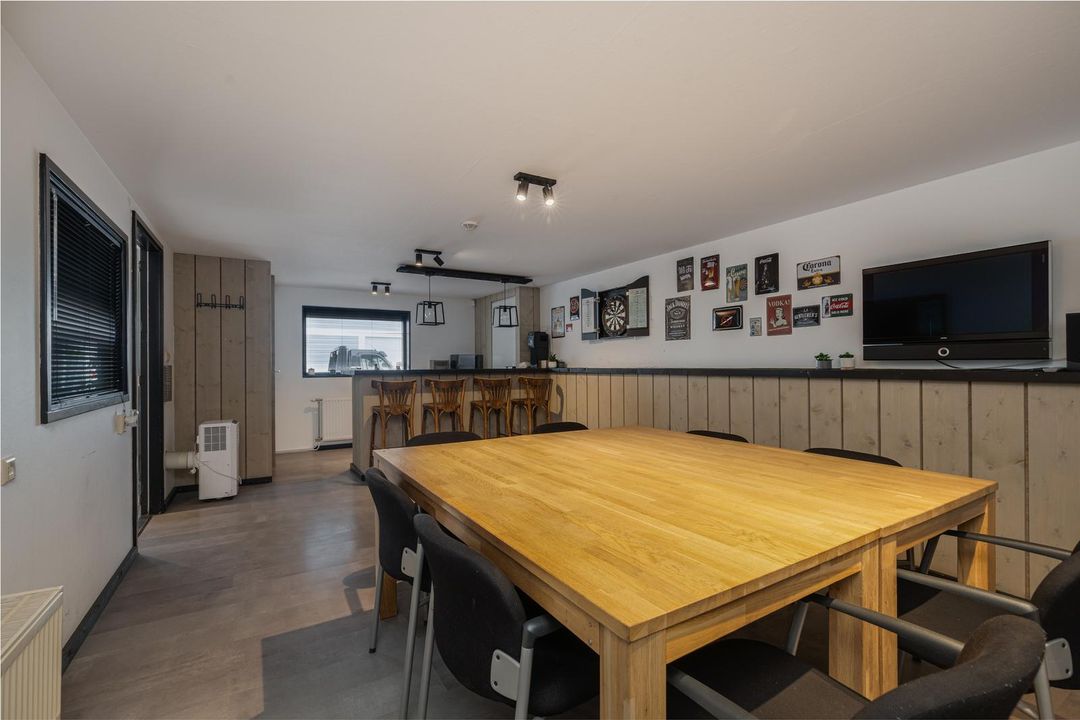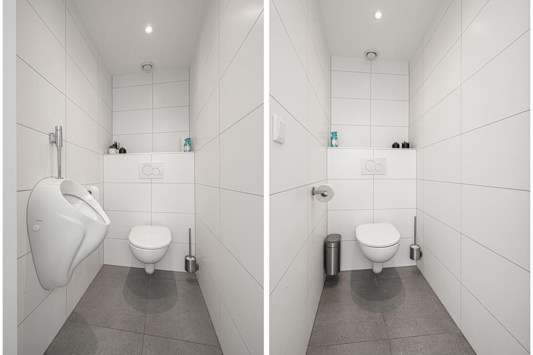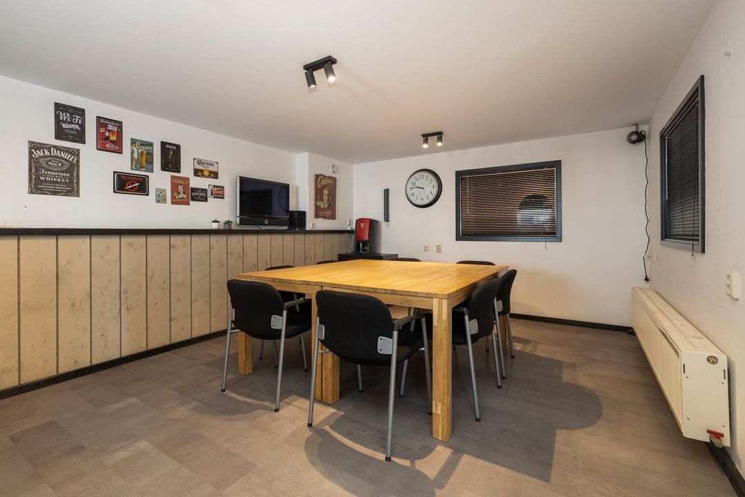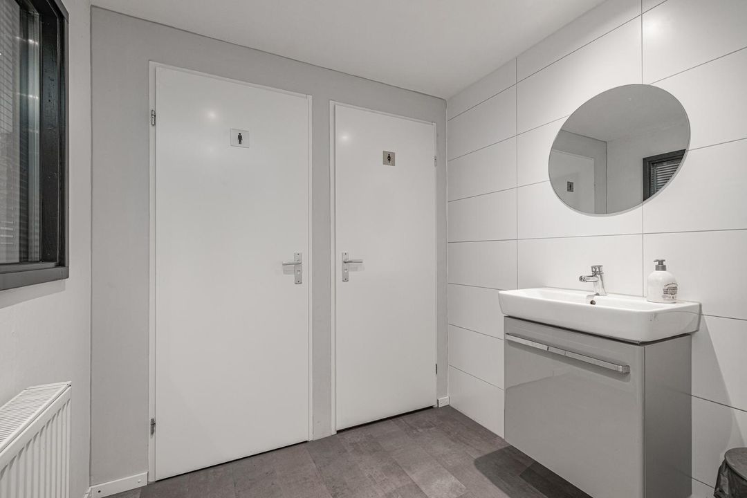 Entrance hall with access to all rooms. Office/canteen of approx. 30 m² located at the front of the building. Equipped with a kitchen with bar, radiators and cupboard with central heating boiler. Access to the toilets from the landing. Both toilets are fully tiled in white and equipped with a wall-mounted toilet, one of which also has a urinal. Separate washbasin with cabinet and mirror.