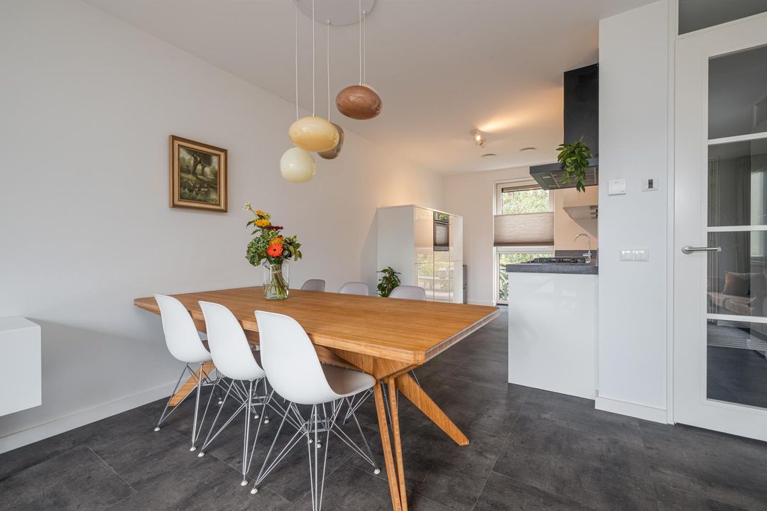 De praktisch en modern ingerichte halfopen keuken van ca. 10m2 is uitgerust met diverse inbouwapparatuur, waaronder een gaskookplaat, koelkast, spoelbak, vaatwasser (2024) en afzuigkap. Dankzij de grote raampartij aan de voorzijde oogt de keuken licht en ruim, wat bijdraagt aan een open en luchtige sfeer over de gehele begane grond.