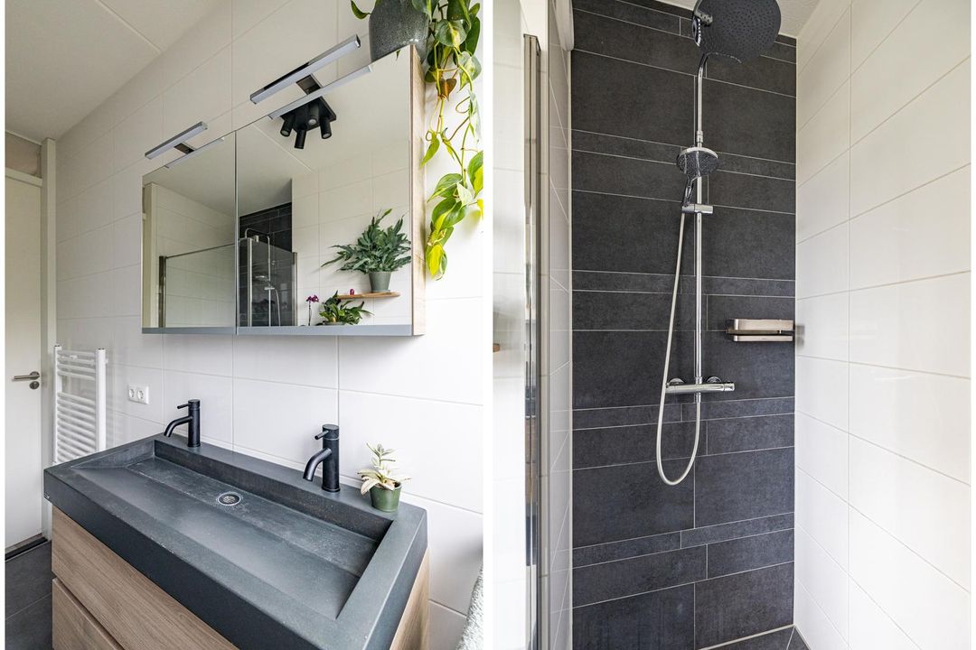 De luxe, moderne badkamer is volledig betegeld en beschikt over een wastafel met meubel met dubbele kranen, een tweede toilet en een ruime inloopdouche, waardoor comfort en stijl perfect samenkomen. De badkamer is geheel betegeld en voorzien van een grote raampartij.