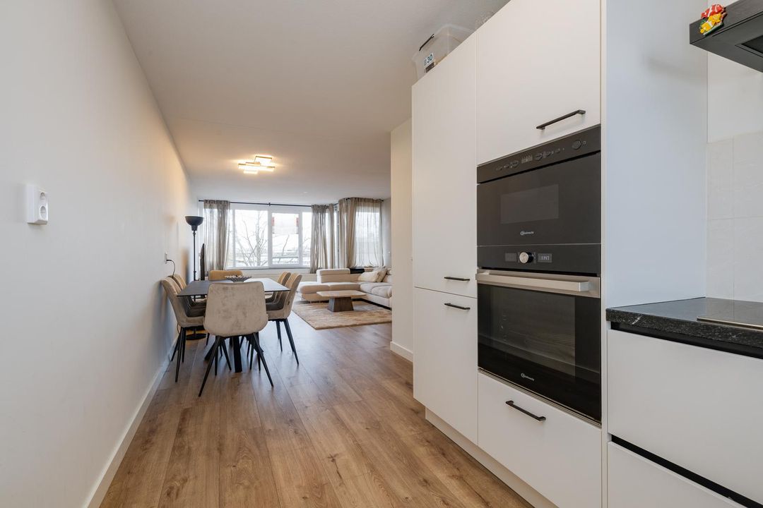 De luxe living voelt dankzij de grote raampartijen en strakke wanden licht en knus aan. Er is voldoende ruimte om tot rust te komen én om gezellig met elkaar te dineren. De lichte keuken, eveneens door een grote raampartij, bevindt zich aan de achterzijde. Deze is strak en modern uitgevoerd in magnolia mat en zwarte tinten en uitgerust met diverse inbouwapparatuur, zoals een koel-/vriescombinatie, elektrische oven en magnetron, kookplaat, afzuigkap en vaatwasser.