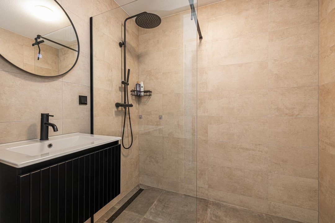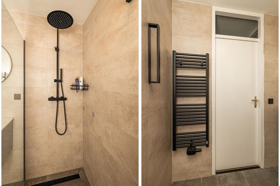 De luxe badkamer is vanuit de gang bereikbaar. Deze is volledig betegeld met beige kleurige wandtegels en een lichtgrijze vloertegel. De badkamer heeft verder zwarte accenten en voorzien van een inloop(regen)douche en een wastafel. Een heerlijke ruimte om te ontspannen.