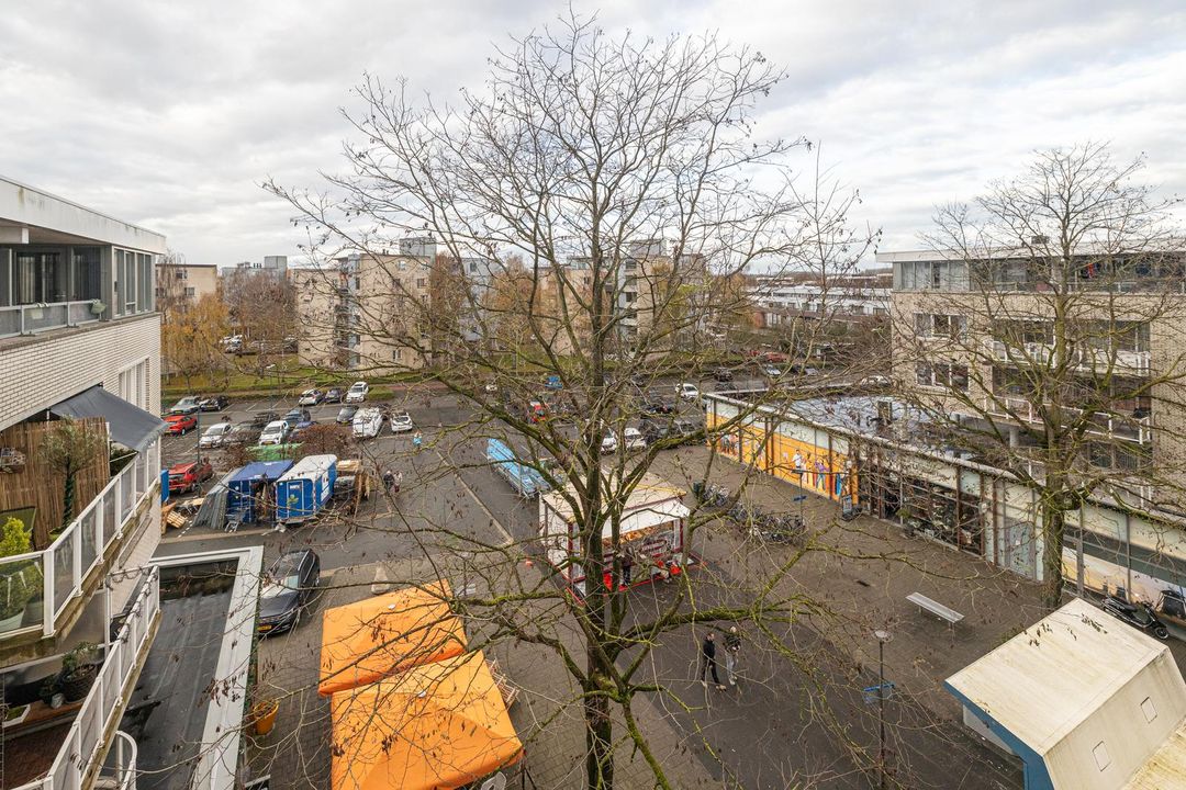 Vanuit de woonkamer heb je toegang tot het balkon op het noordwesten, dat uitkijkt over de winkels en een oppervlakte heeft van ca. 35m² (incl. keuken).