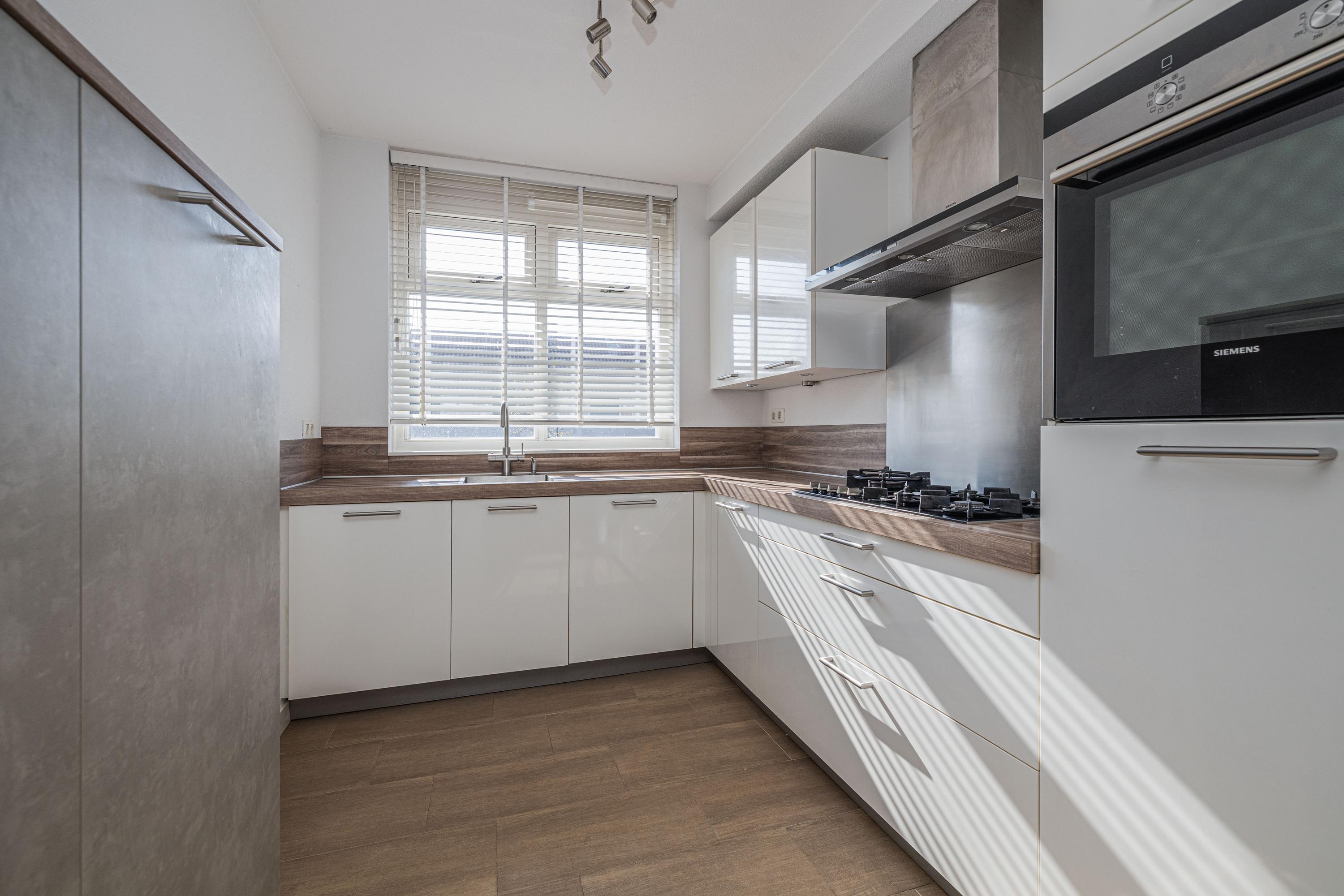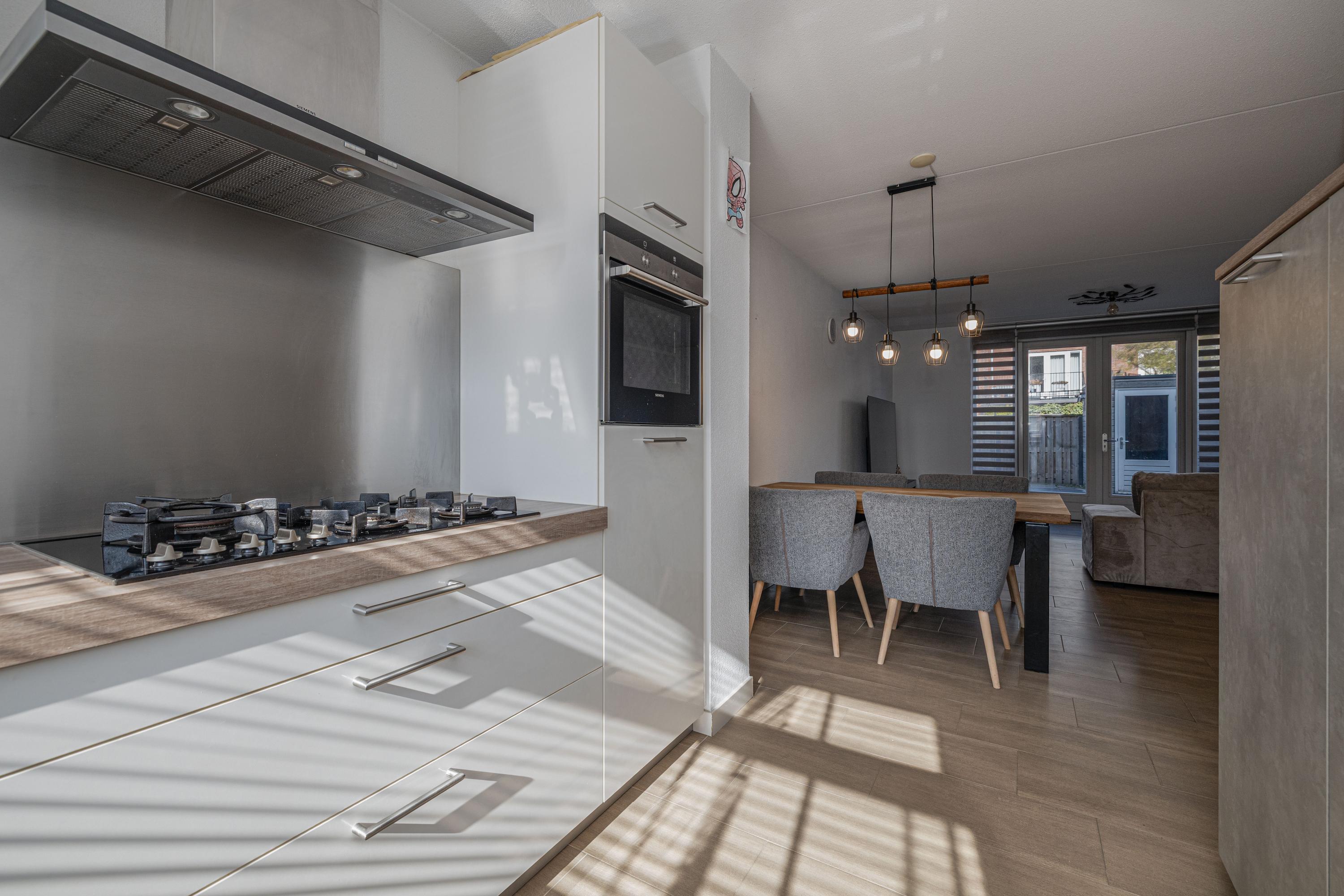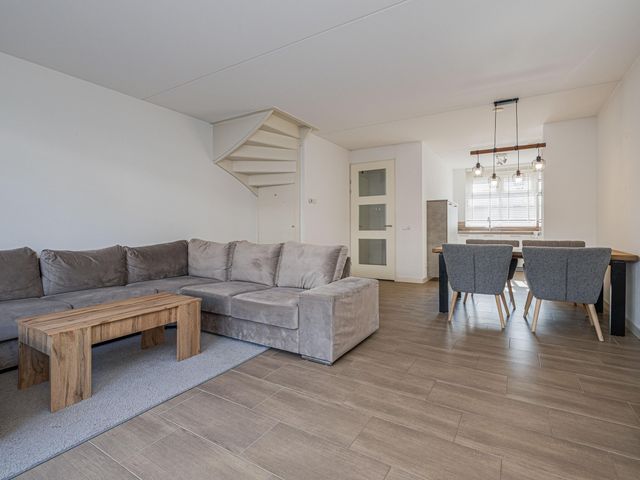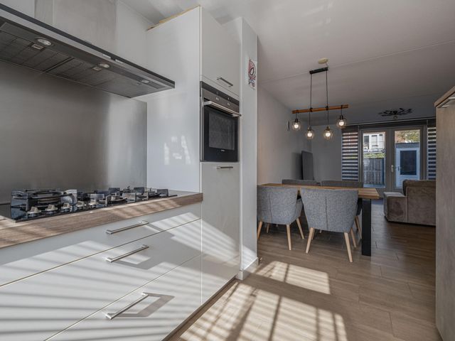 Entree in de hal met toegang tot het toilet, de trap naar de 1e verdieping en de deur naar het woongedeelte. Heerlijk, lichte en tuingerichte woonkamer van ca. 30m2 voorzien van een laminaat vloer met vloerverwarming, trapkast en met dubbele openslaande deuren naar de achtertuin. De achtertuin is uitgevoerd met grote grijze tegels en voorzien van een schuur en achterom. De moderne open keuken beschikt over diverse inbouwapparatuur te weten; vaatwasser, oven, vriezer, koelkast, gaskookplaat en een afzuigkap. Vanaf de voorzijde van de woning is er mooi en vrij uitzicht.