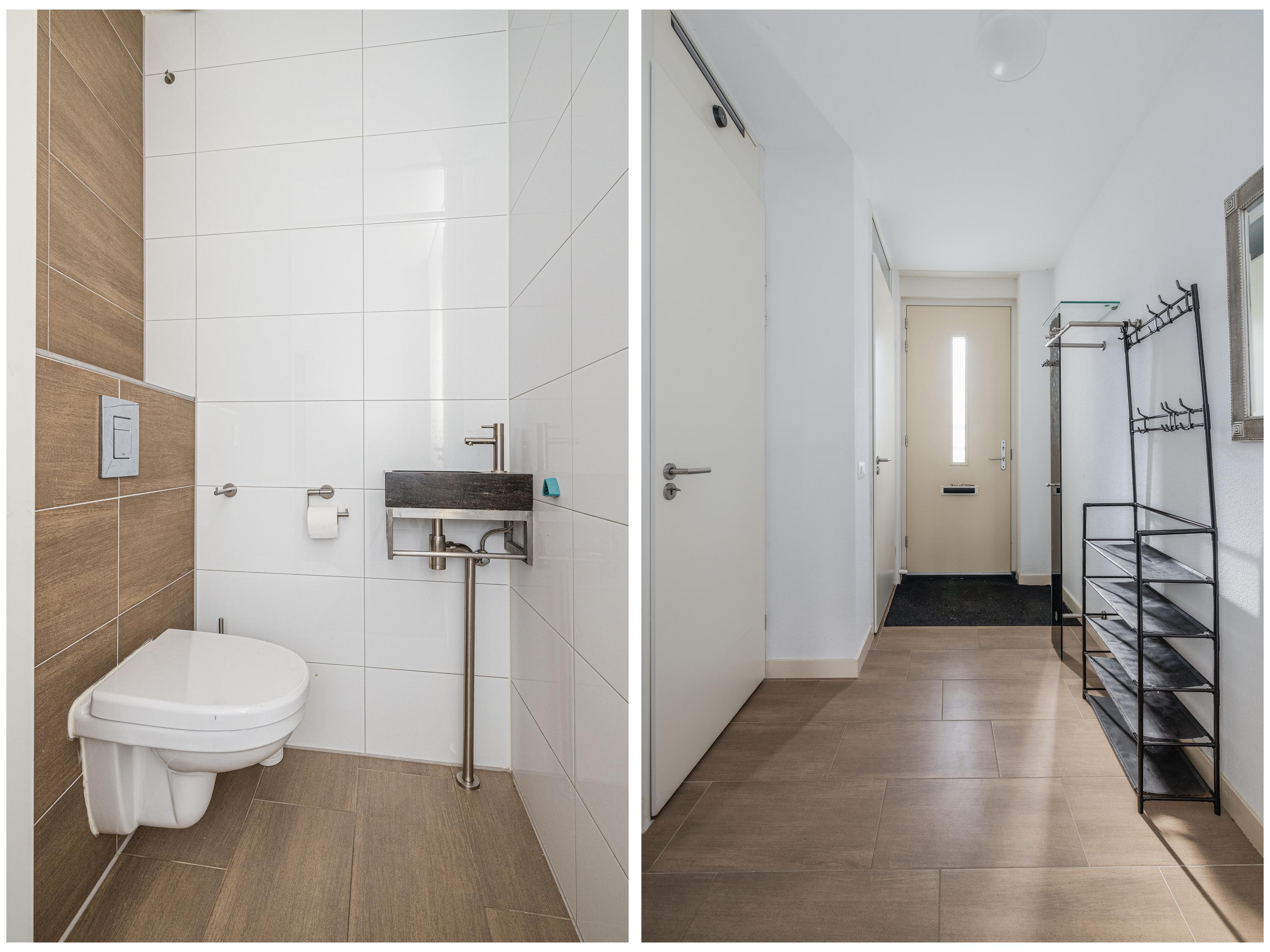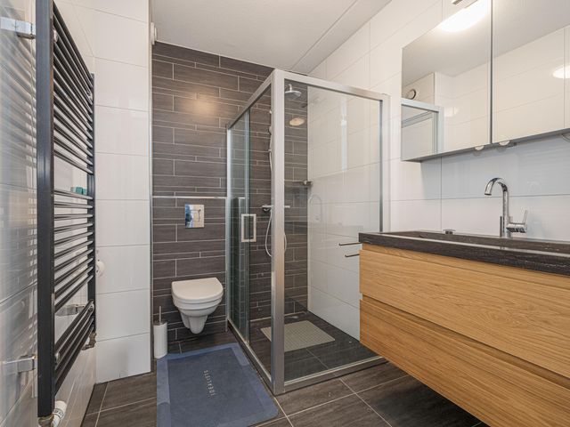 De moderne badkamer beschikt over een tweede toilet, inloopdouche, wastafelmeubel en design radiator. De gehele badkamer is betegeld in wit/grijs.
