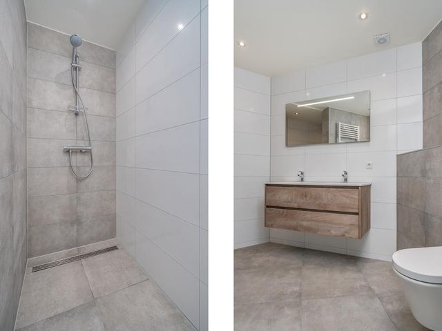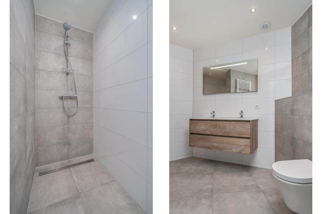 Vanuit de woonkamer zijn via een hal, de twee slaapkamers en badkamer te bereiken. De twee slaapkamers zijn ca. 16m2 en ca. 12m2 en beschikken beide over een airconditioning en een hoog plafond waardoor er een speelse indeling ontstaan is. De volledig betegelde badkamer is voorzien van een tweede toilet, dubbel wastafelmeubel, inloopdouche en designradiator.