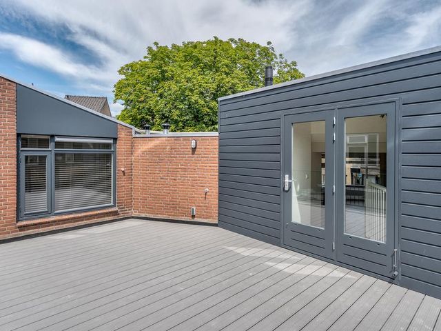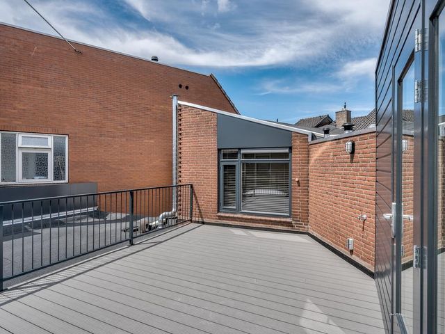 Het dakterras is te bereiken middels een paar treden vanuit de hal. Het dakterras is heerlijk gelegen op het zuiden en is ca. 23m2.