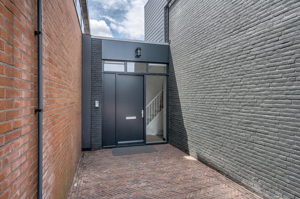 Hal met hangend luxe toilet met fonteintje, bergruimte met opstelplaats voor wasmachine/wasdroger, opgang naar het dakterras en toegang tot de living middels enkele traptreden.