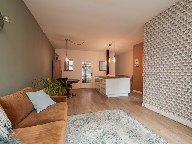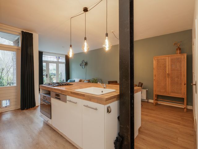 Via de hal heb je toegang tot de royale woonkeuken met een keukeneiland, voorzien van een 4-pits gasfornuis, oven, vaatwasser, spoelbak, een houten werkblad en voldoende kastruimte. Aangrenzend bevindt zich de woonkamer van 21m², die een karakteristieke uitstraling heeft en is voorzien van grote raampartijen. Via de openslaande deuren aan de achterzijde van de woonkamer heb je toegang tot de tuin. De achtertuin is gelegen op het zonnige zuid-oosten en is speels aangelegd.