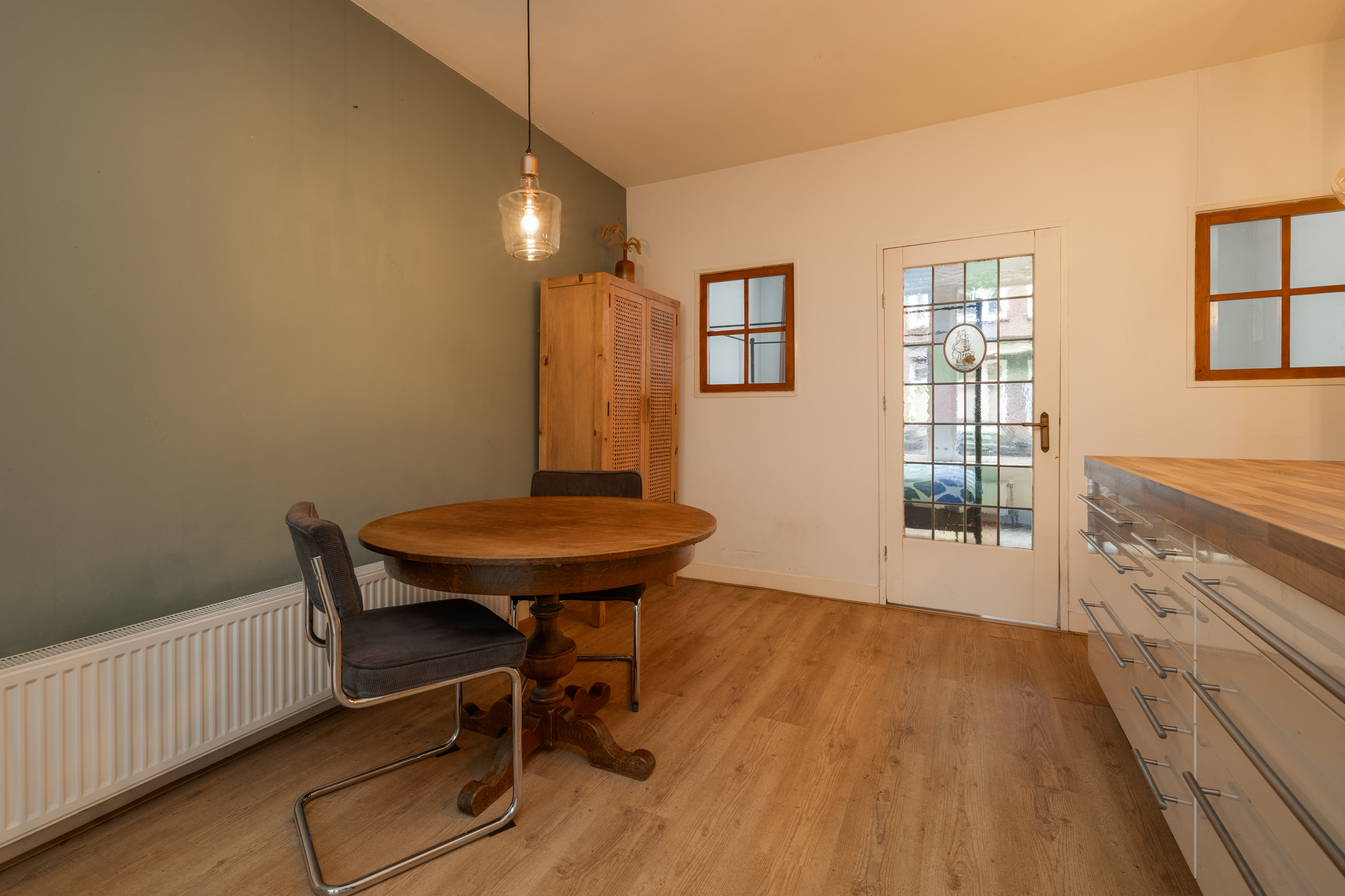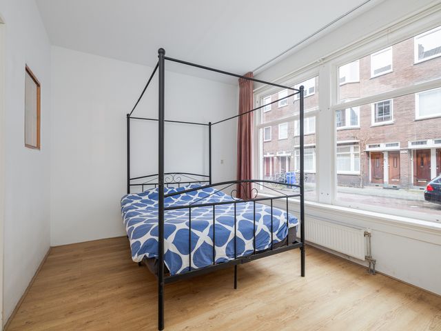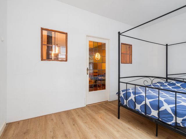 Via de woonkamer heb je toegang tot de slaapkamer met een originele glas-in-looddeur, een echte eyecatcher in de woning. De slaapkamer van 13m² voelt bijzonder licht aan dankzij de grote raampartijen met uitzicht over de straat. Deze slaapkamer is gelegen aan de voorzijde van de woning.
