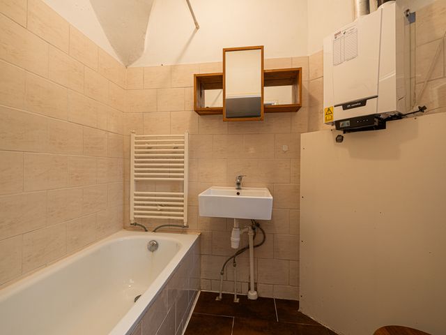 De badkamer is bereikbaar via de woonkeuken. Met een oppervlakte van circa 3m² is deze voorzien van diverse gemakken, waaronder een ligbad, een handdoekradiator, een wastafel, kastruimte en een regendouche. Via een te openen raam kan er geventileerd worden. Tevens bevindt zich hier de opstelling van de cv-ketel.