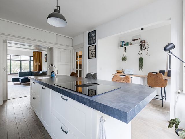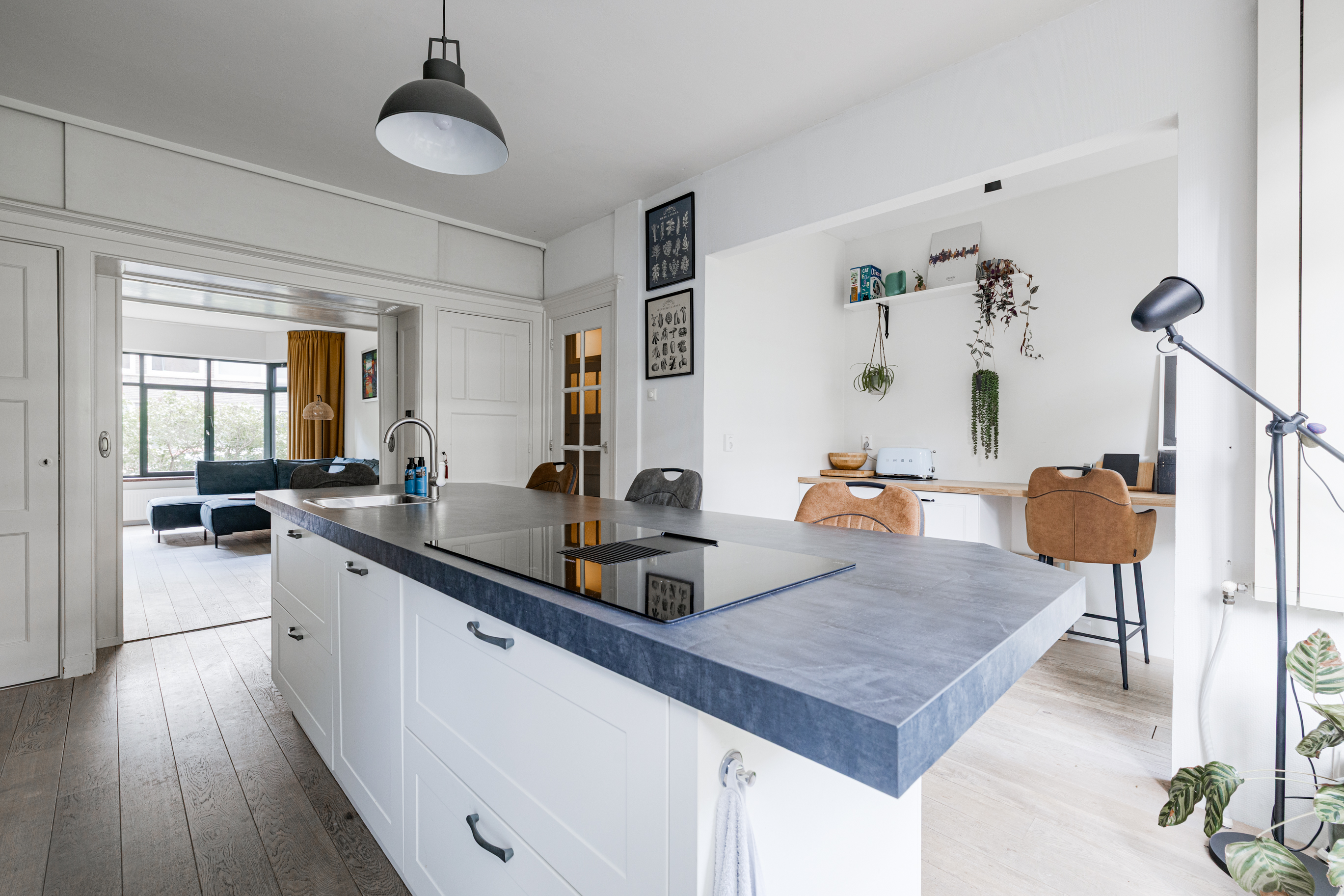 De royale woonkeuken van maar liefst ca. 23m2 bevindt zich aan de achterzijde van de woning. Hier kook en klets je met familie of vrienden aan het heerlijke kookeiland terwijl je uitkijkt op jouw eigen achtertuin van 93m². Serieus, dat is bijna een stadspark! De uitvoering van de keuken bestaat uit een inductiekookplaat met ingebouwde afzuigkap, Amerikaanse koelkast, combioven, oven en een vaatwasser.