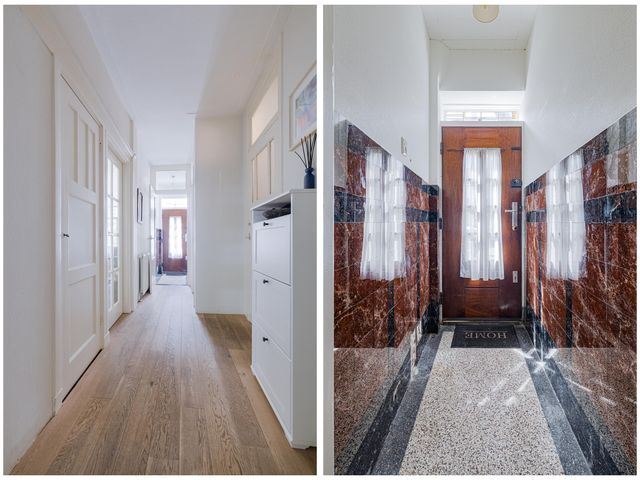 Entree in de hal met toegang tot alle vertrekken. Wij beginnen in de woonkamer, terig te vinden aan je rechter hand. De woonkamer van ca. 18m2 is lekker licht en knus. Aan de voorzijde tref je een karakteristieke erker voorzien van aluminium kozijnen met trippel glas. Via de originele glas-in-lood schuifdeuren, een echte eyecatcher van het huis, loop je door naar de keuken.