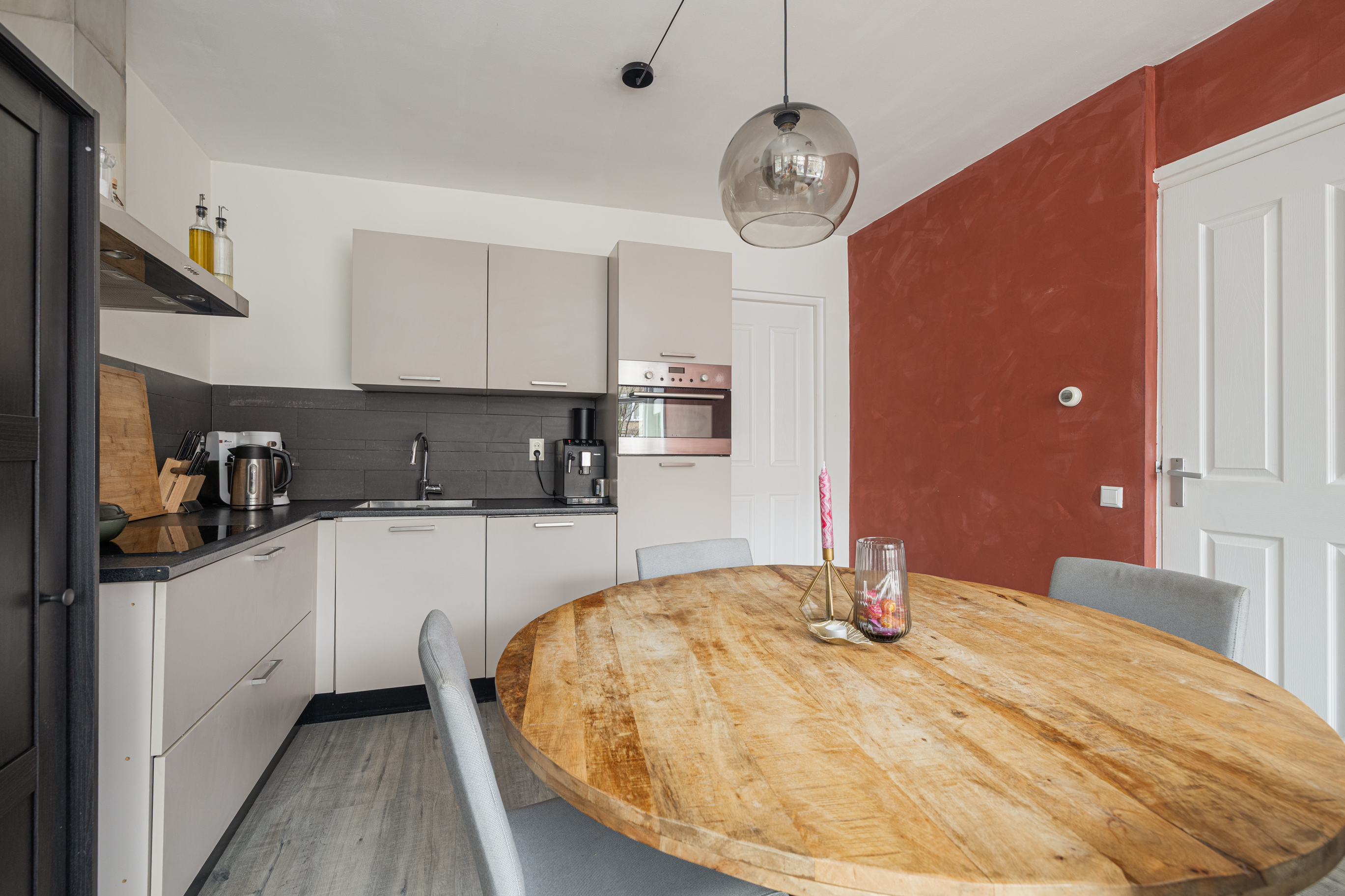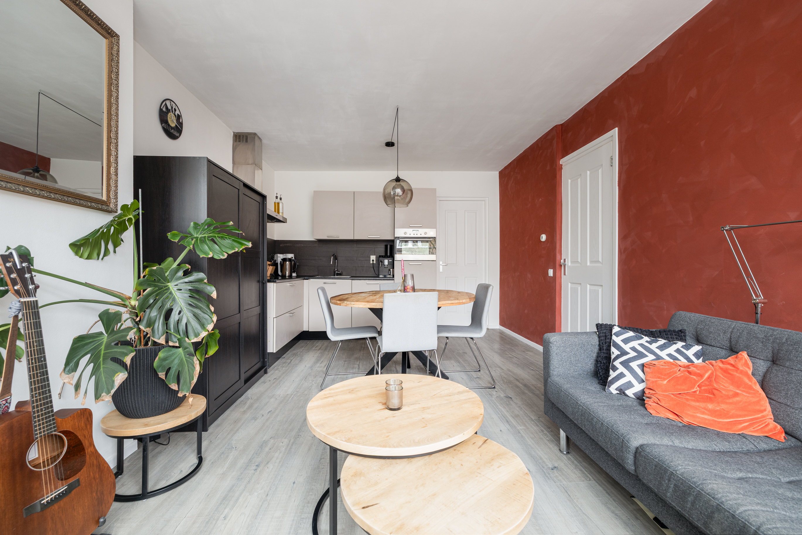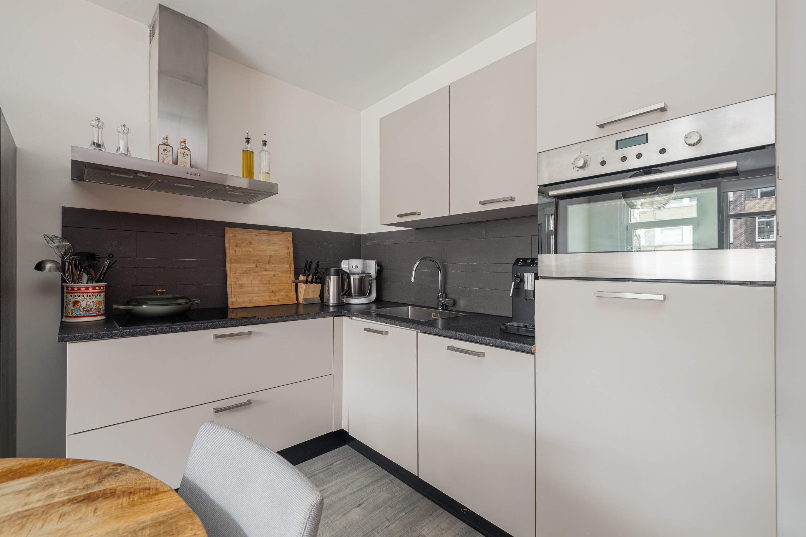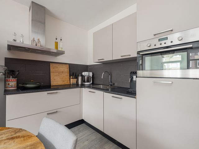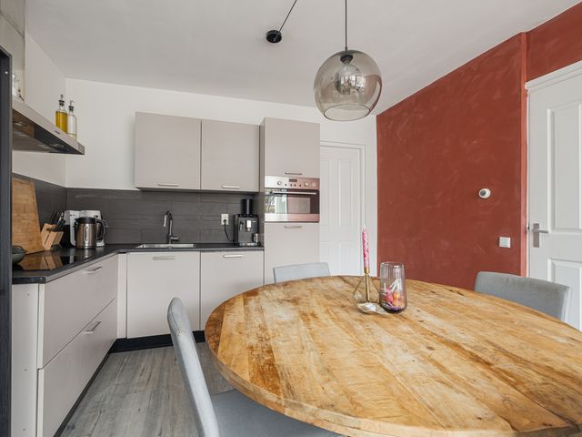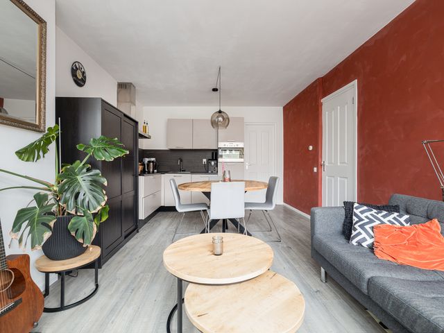 De woonkamer bevindt zich aan de voorzijde van de woning, biedt uitzicht over de straat en beschikt over grote raampartijen die zorgen voor veel natuurlijke lichtinval. De open keuken is voorzien van diverse inbouwapparatuur, waaronder een kookplaat, afzuigkap, koelkast, vaatwasser en combi-oven/magnetron.