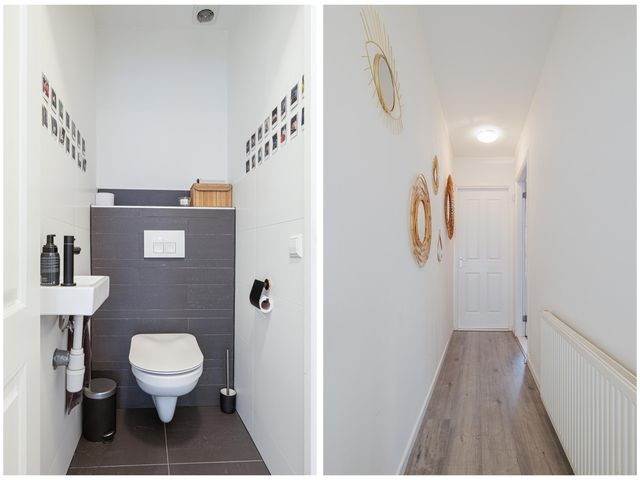 Via de overloop heb je toegang tot diverse vertrekken, zoals de woonkamer, de studeer-/kinderkamer en het toilet. Het toilet is voorzien van een hangend toilet en een fonteintje.