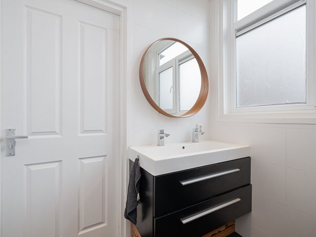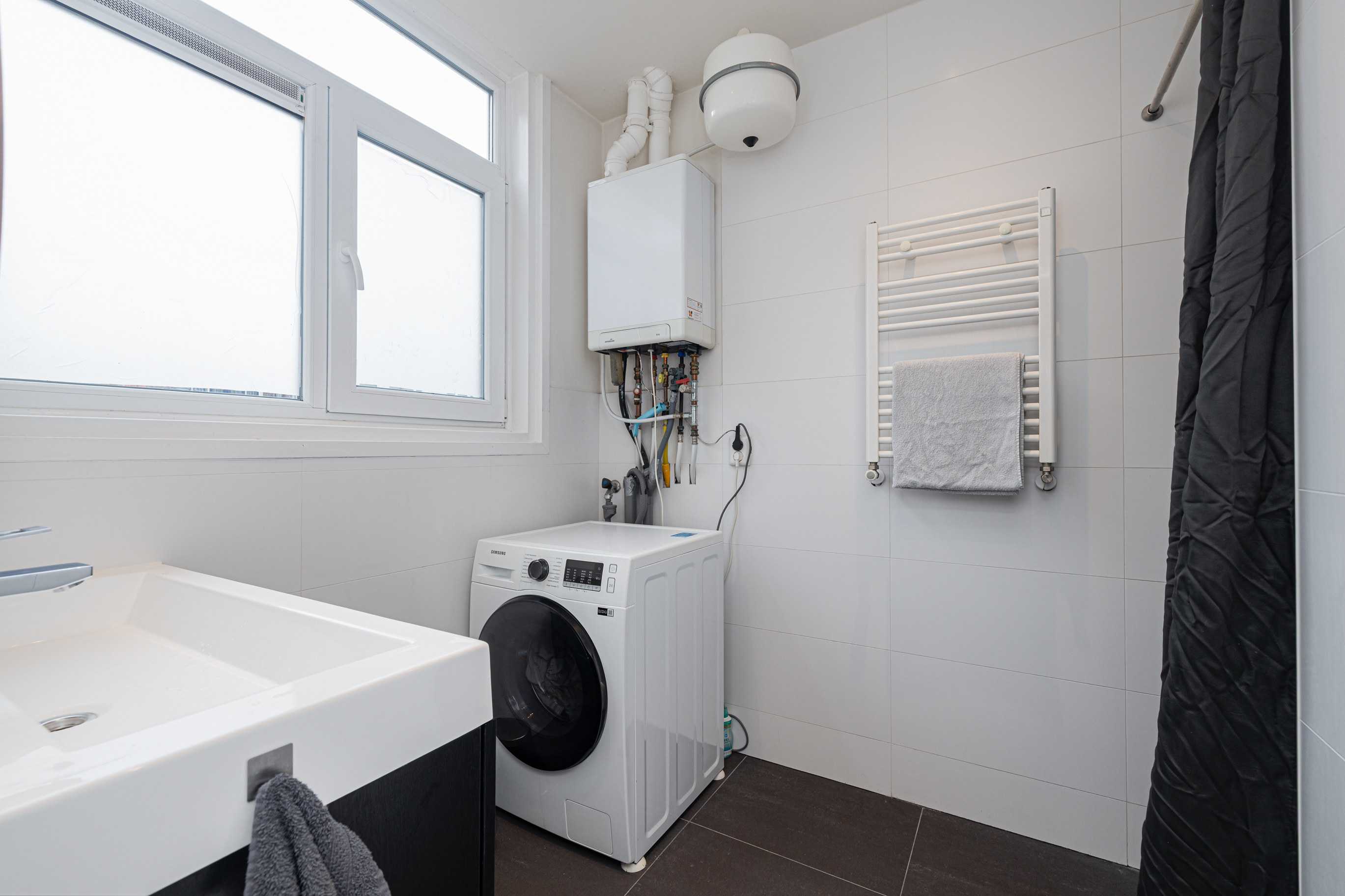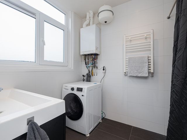 Aansluitend aan de slaapkamer bevindt zich de nette en volledig betegelde badkamer van ca. 5m². Deze is voorzien van een badkamermeubel met wastafel, handdoekradiator, wasmachineaansluiting en een inloopdouche met regendouche. Dankzij de grote raampartij is er bovendien natuurlijke lichtinval en ventilatie.