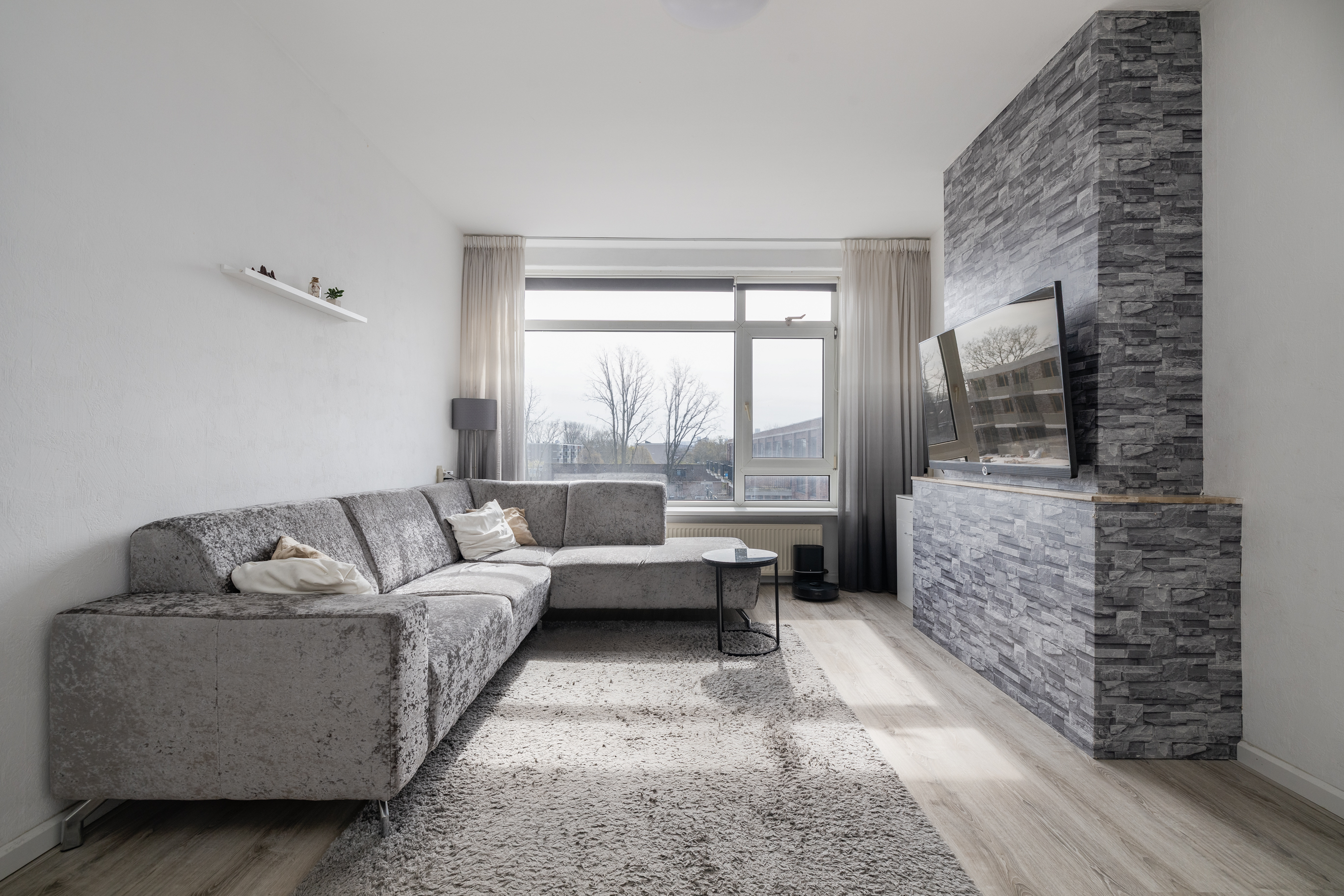 De lichte woonkamer van ca. 21m² is gelegen aan de voorzijde van de woning en biedt een prettig uitzicht over de straat. Dankzij de raampartij over de gehele breedte is er sprake van veel natuurlijke lichtinval. Via de woonkamer is de hoofdslaapkamer van ca. 10m² bereikbaar. Deze kamer is gesitueerd aan de achterzijde van de woning en beschikt eveneens over een grote raampartij.