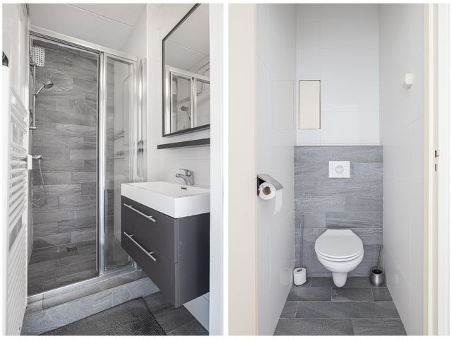 De keurig onderhouden badkamer is volledig betegeld en deels uitgevoerd in stijlvolle grijstinten. De badkamer beschikt over een inloopdouche, een wastafel met meubel en een handdoekradiator.