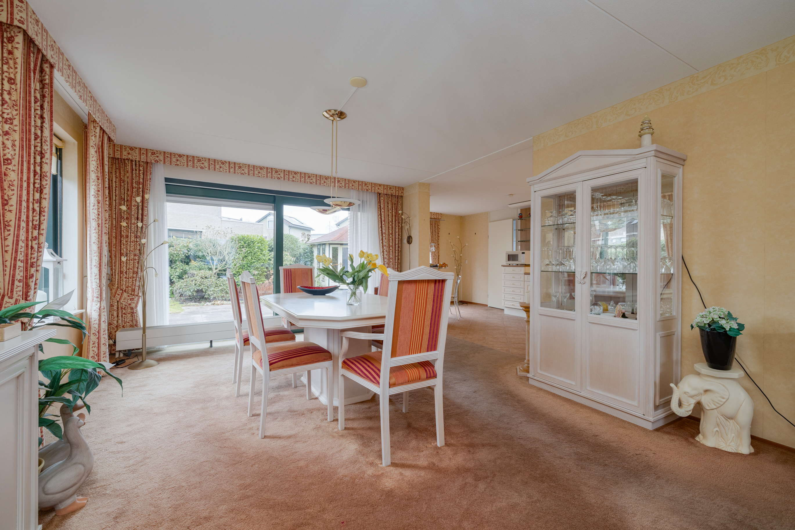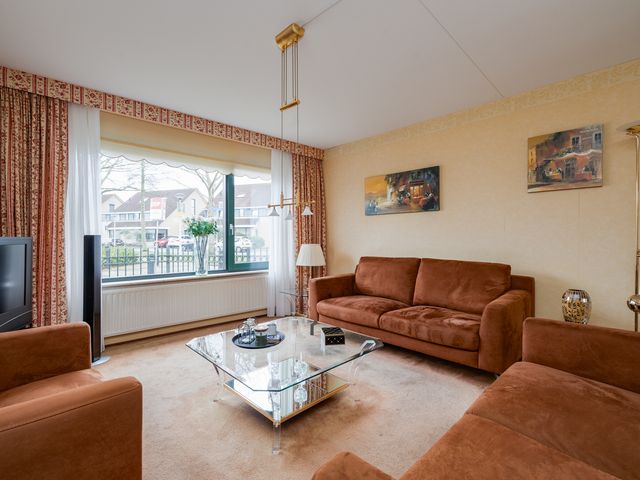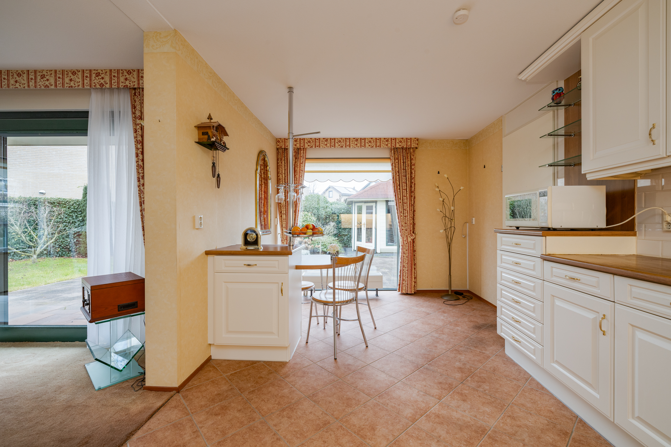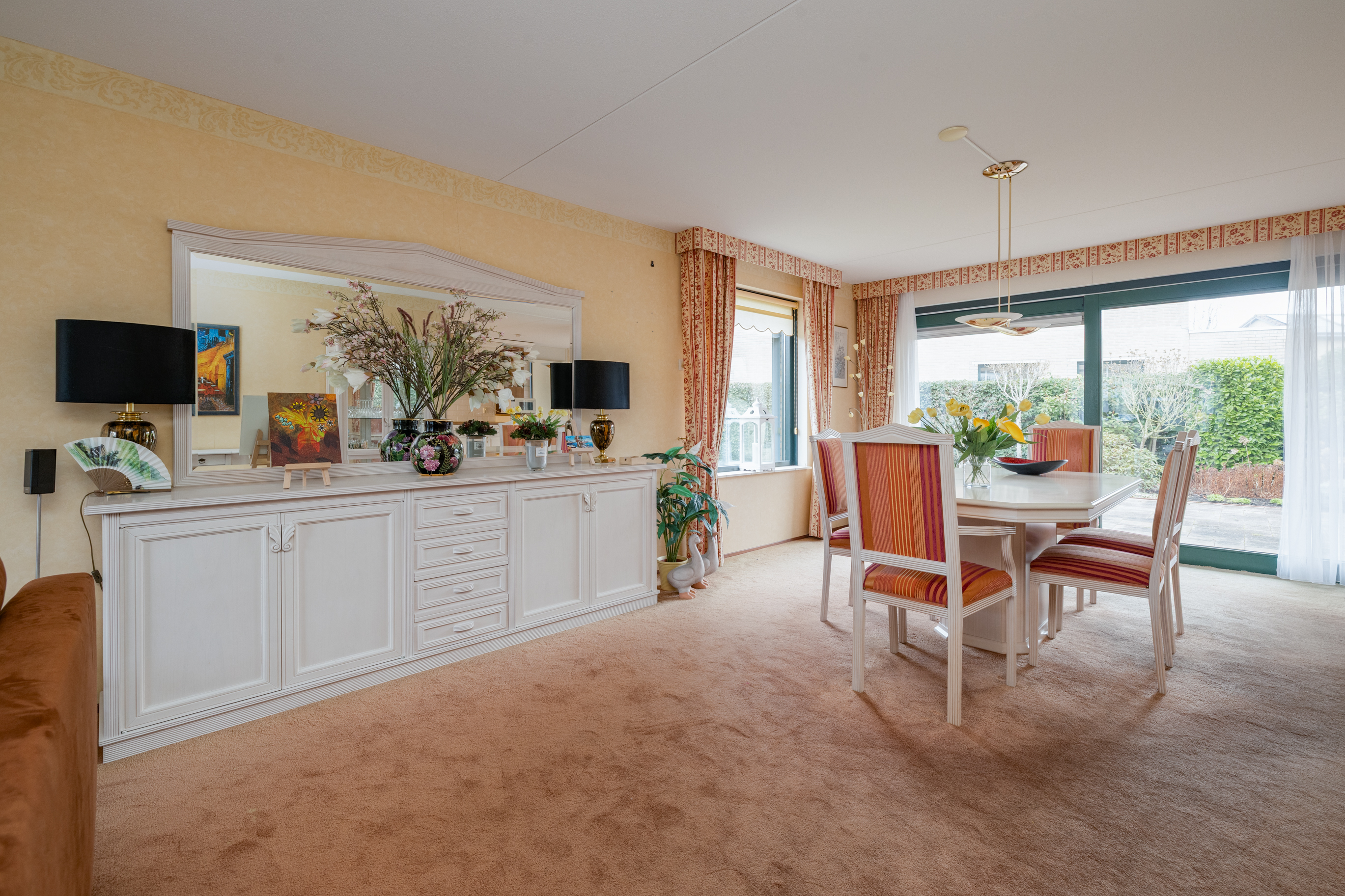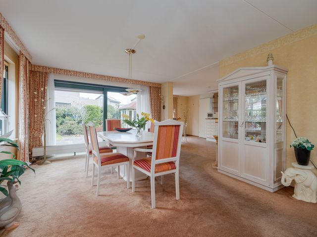 De woonkamer, met een oppervlakte van ca. 2,40m², is gelegen aan de voorzijde van de woning. Deze ruimte voelt zeer licht en ruimtelijk aan dankzij de grote raampartijen aan zowel de voor- als achterzijde. De woning biedt bovendien veel mogelijkheden om het interieur te herinrichten in een moderne stijl. Aan de achterzijde van de woning is voldoende ruimte voor een eetgedeelte, waar je gezellig met familie kunt dineren. Via de schuifdeuren is er toegang tot de tuin.