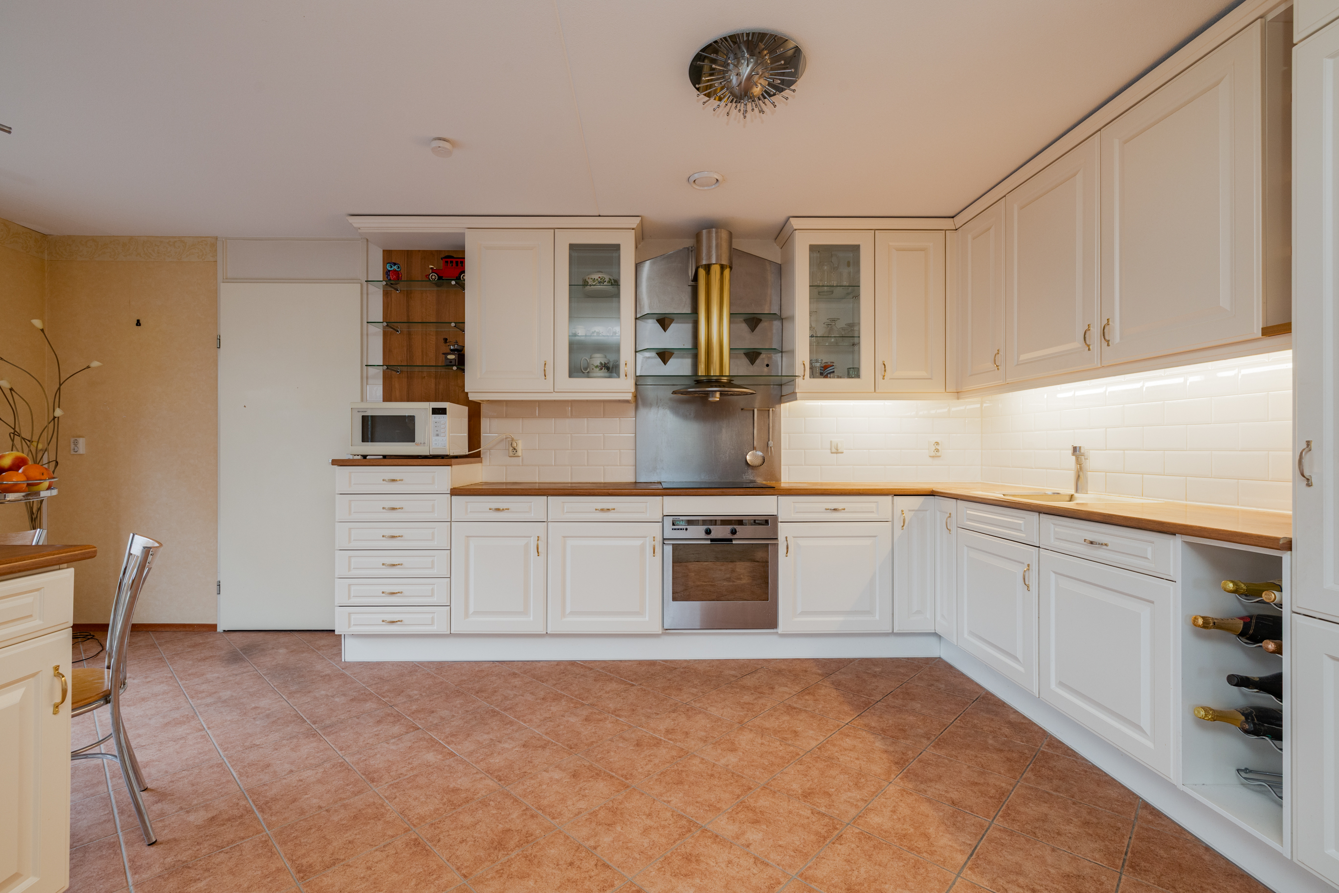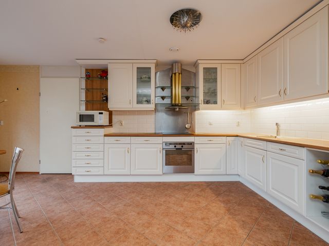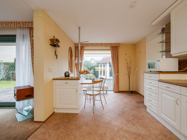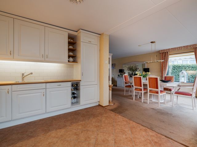 De royale keuken is opgesteld in een L-vorm en is zeer karakteristiek ingericht met een wit-gouden kleurstelling en een houten aanrechtblad. Dankzij de ruimtelijke indeling is er plaats voor een klein eetgedeelte met uitzicht op de tuin. Daarnaast is de keuken voorzien van diverse inbouwapparatuur, waaronder een oven, afzuigkap, inductiekookplaat en spoelbak.