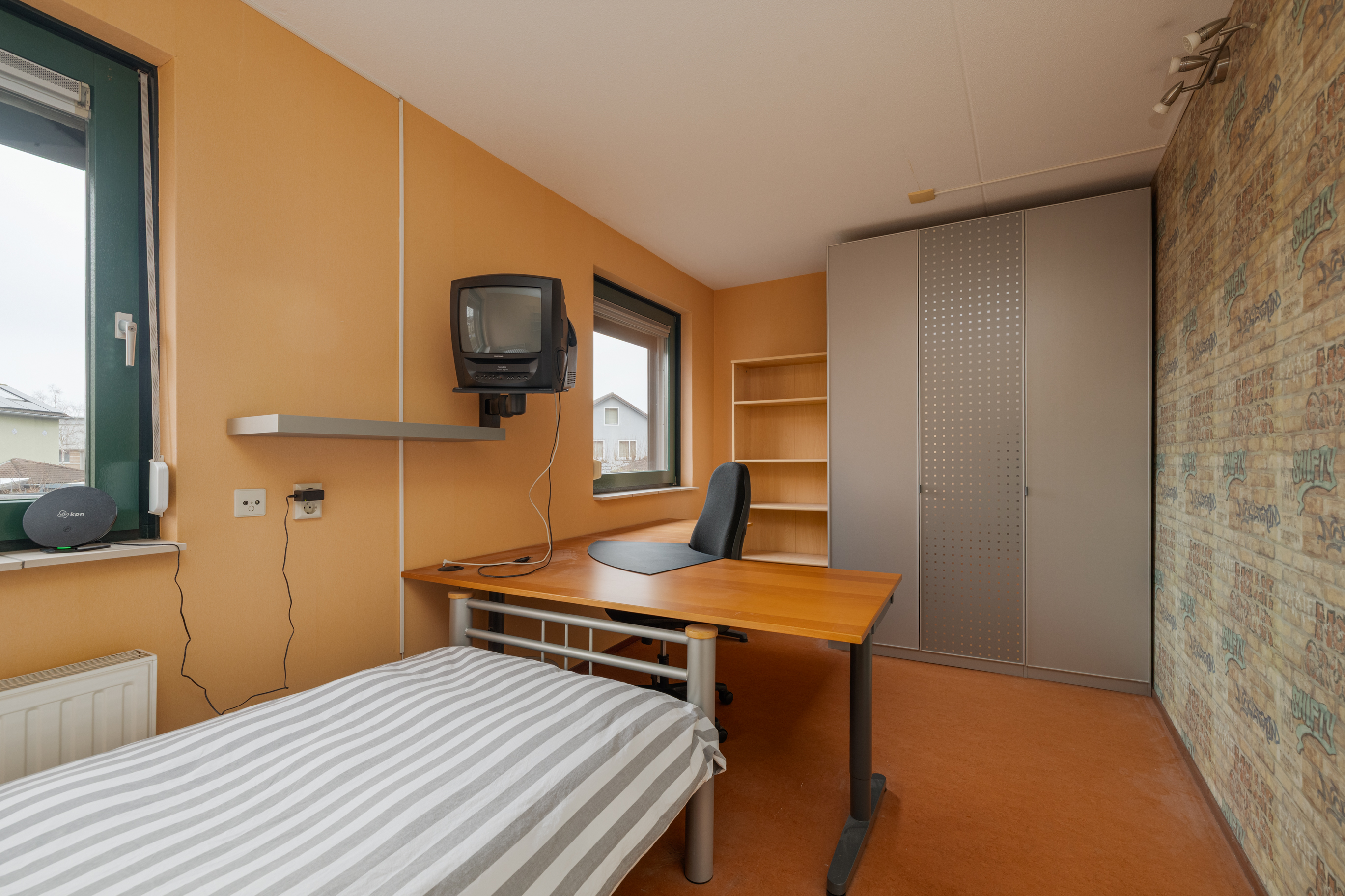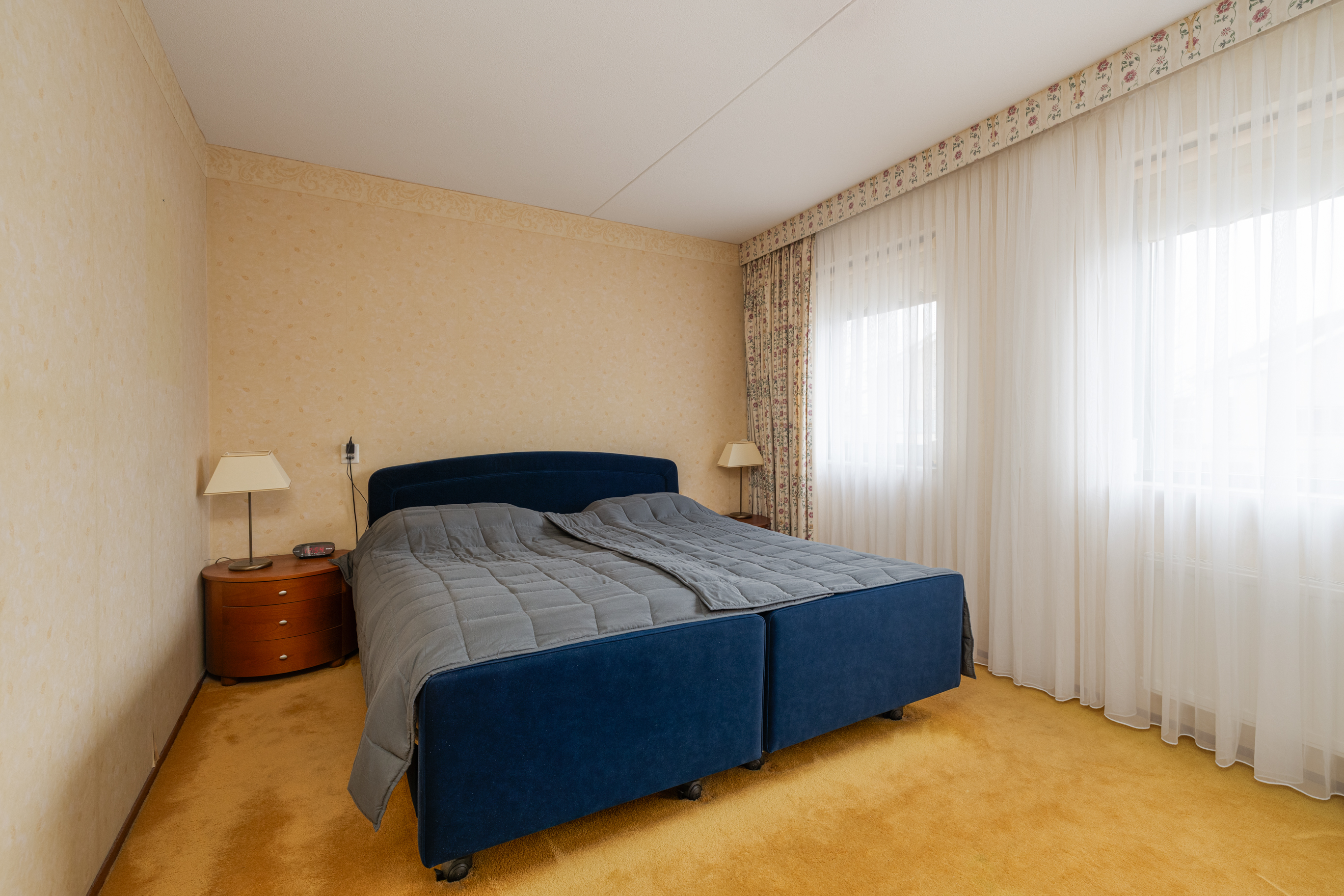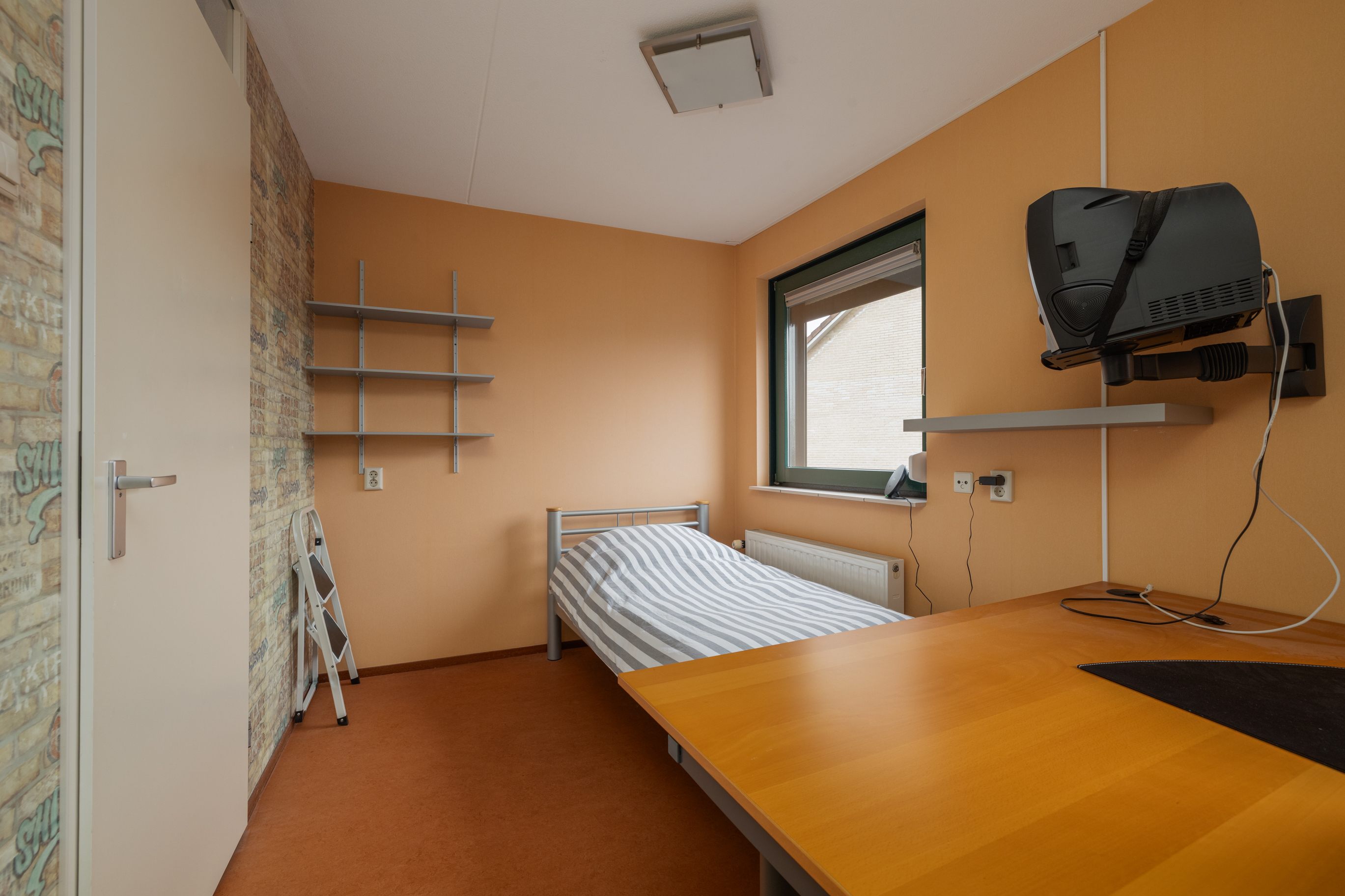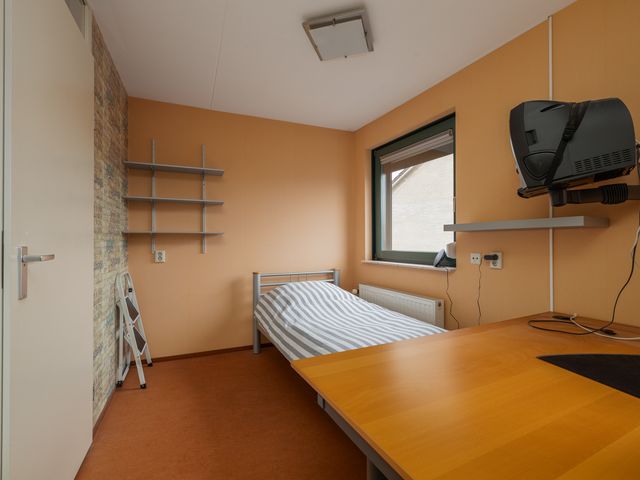 De tweede slaapkamer, gelegen aan de achterzijde van de woning, heeft een oppervlakte van ca. 12m², beschikt over twee raampartijen en is perfect geschikt als kinder-, logeer- of studeerkamer.