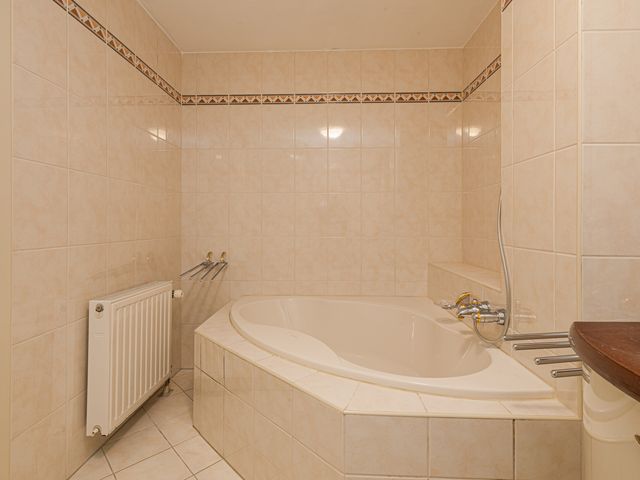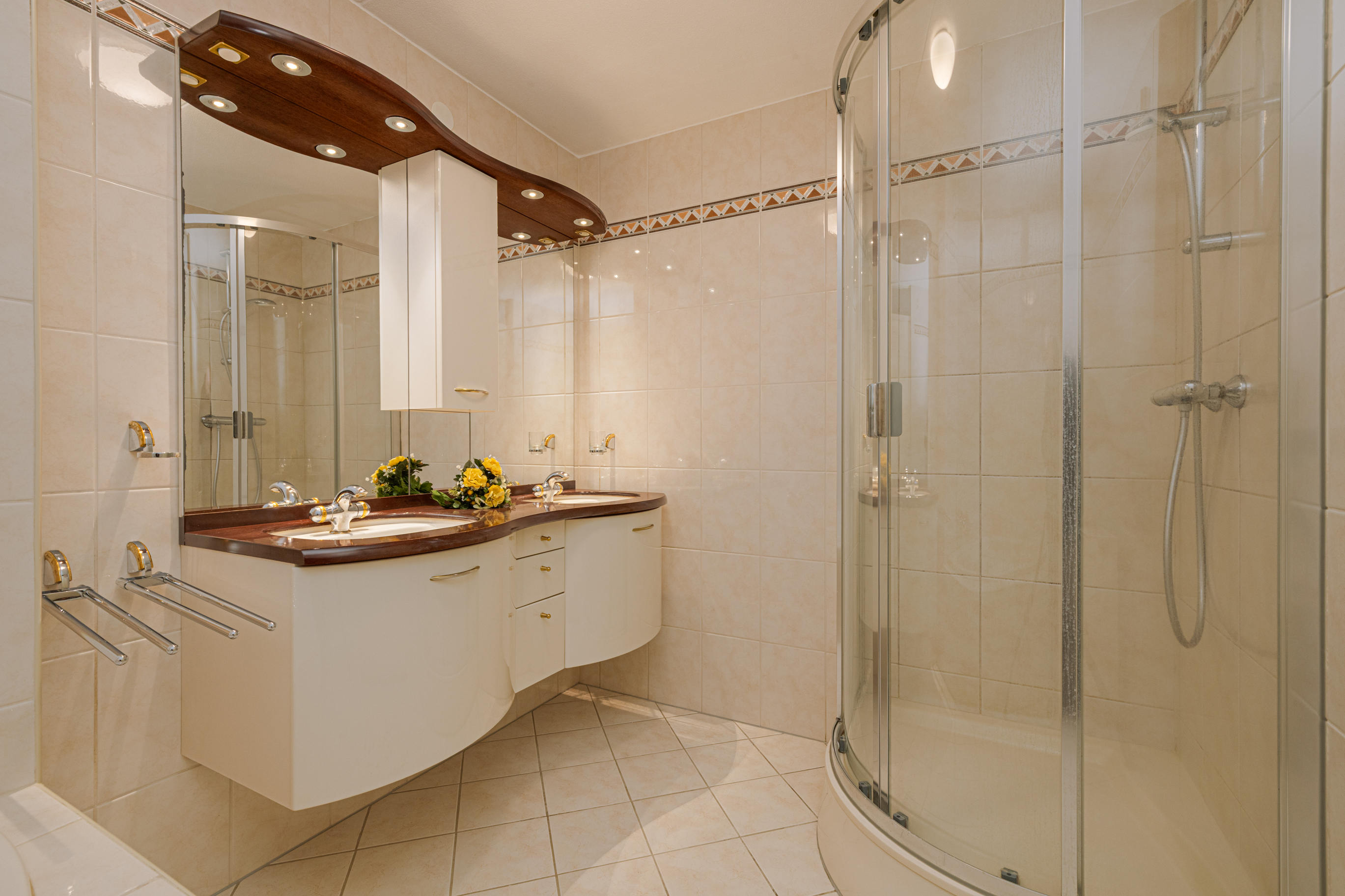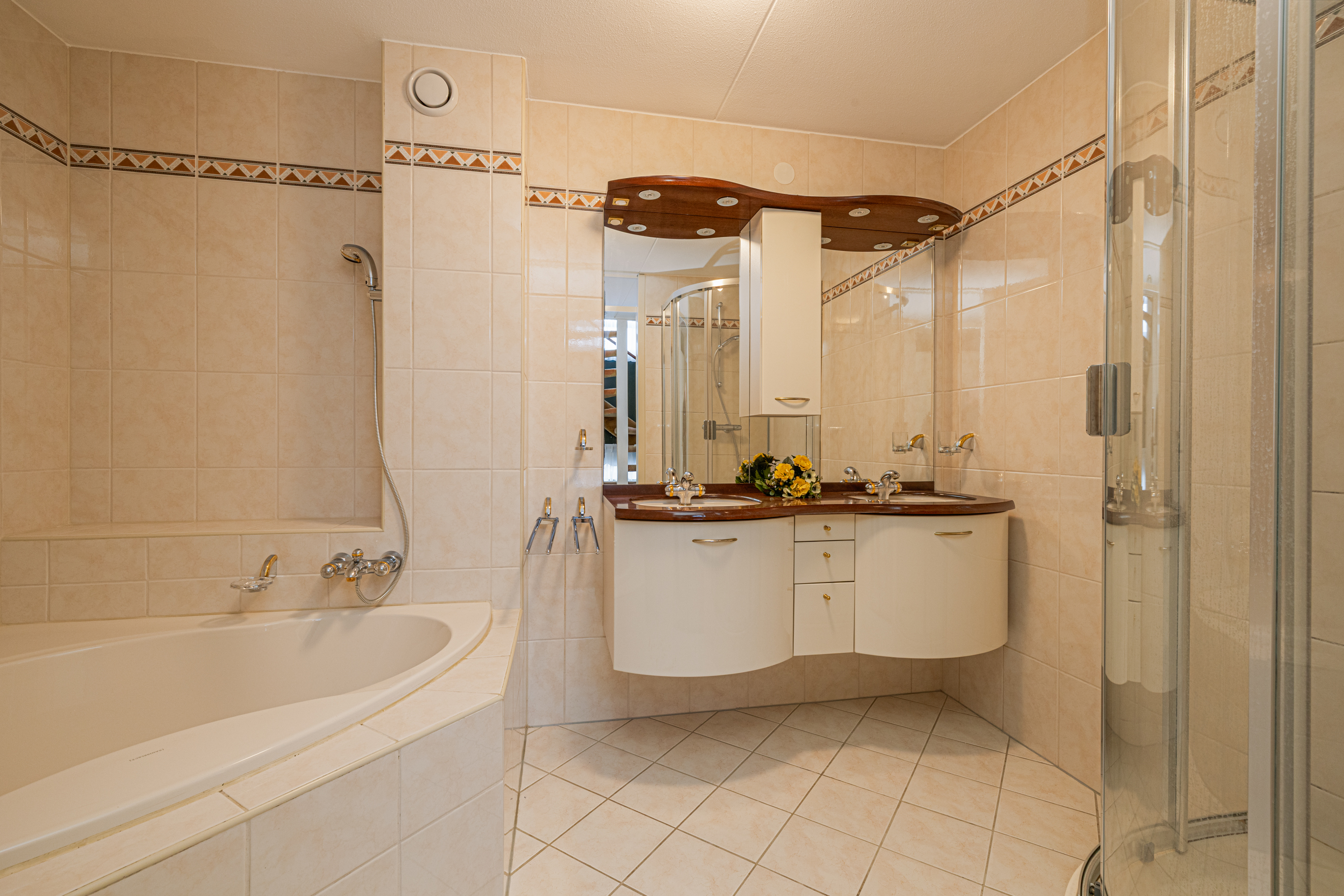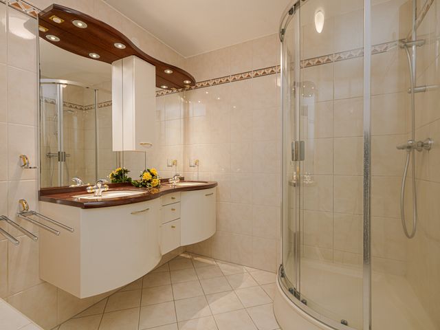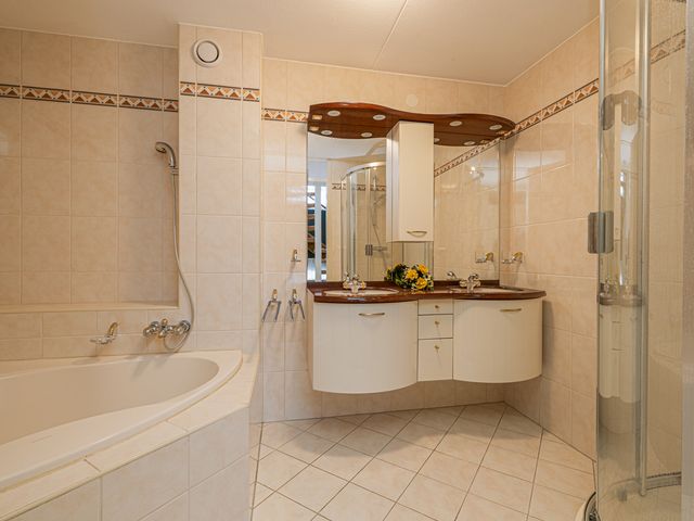 De badkamer met een klassieke uitstraling is voorzien van een hoek-ligbad met douche, een dubbele wastafel met wastafelmeubel en een douchecabine. Deze ruimte heeft een oppervlakte van ca. 7m² en biedt tal van mogelijkheden om deze naar eigen smaak aan te passen.
