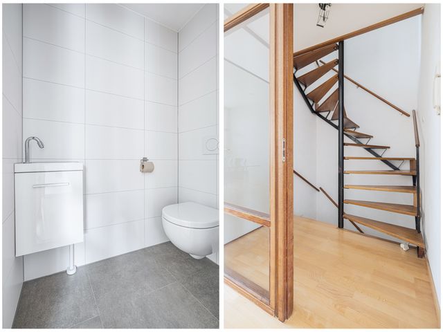 Hal met apart toilet met fonteintje (2024), trapopgang naar de tweede verdieping en toegang tot de living.