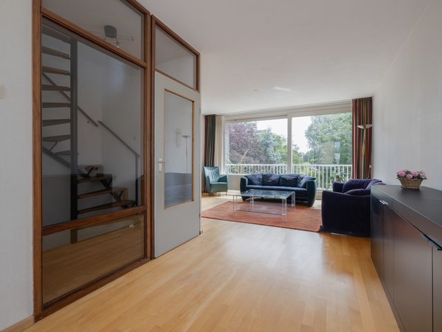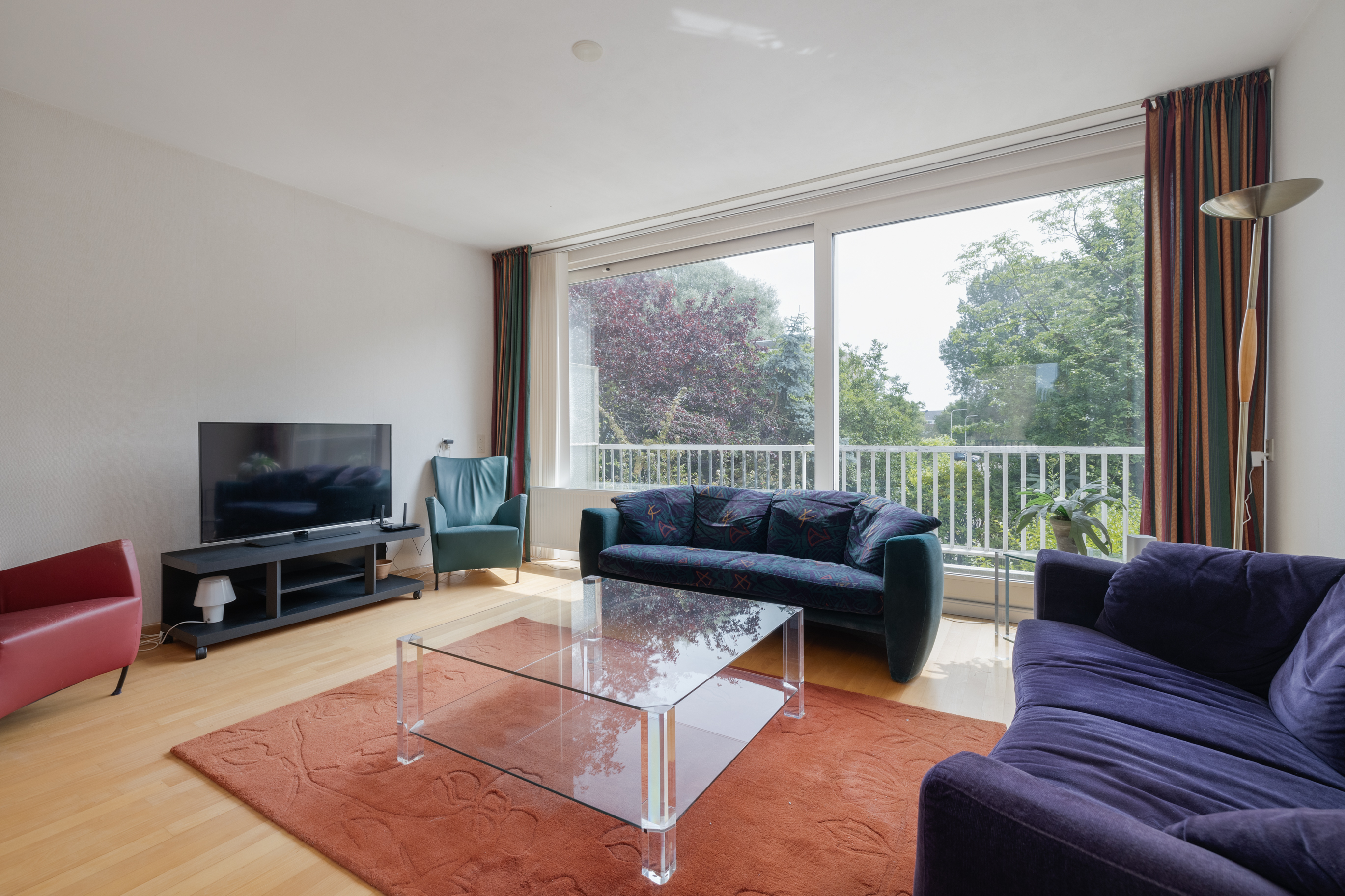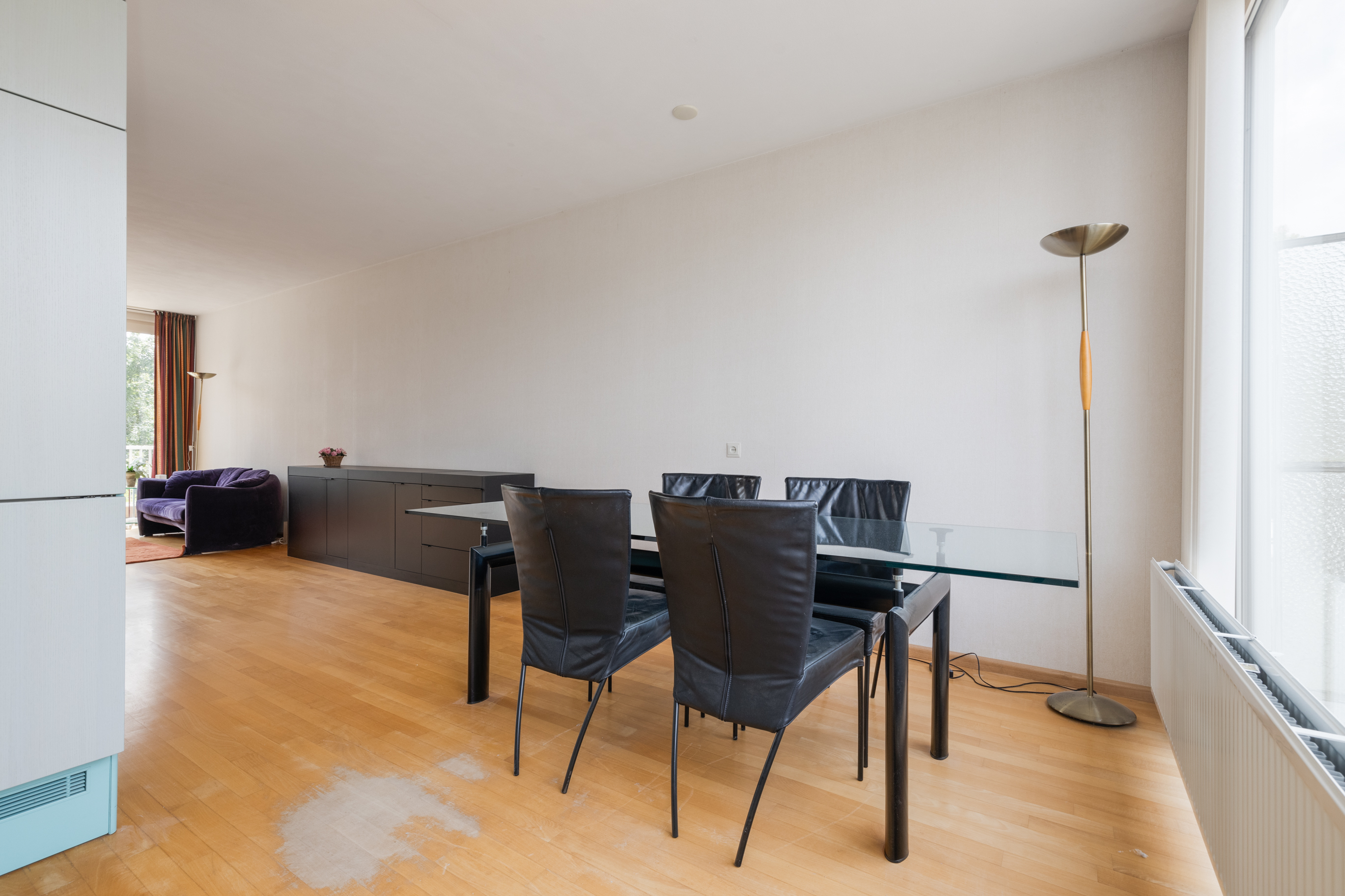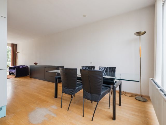 De eethoek bestaat uit een grote rechthoekige tafel met een viertal zwarte stoelen. De woonkamer is gelegen aan de achterzijde en biedt middels een grote schuifpui toegang tot het balkon. Vanaf het balkon prachtig uitzicht over de achtertuin en veel groen! De woonkamer bestaat uit twee zitbanken, twee fauteuils, een vloerkleed, een salontafel en een televisiemeubel.