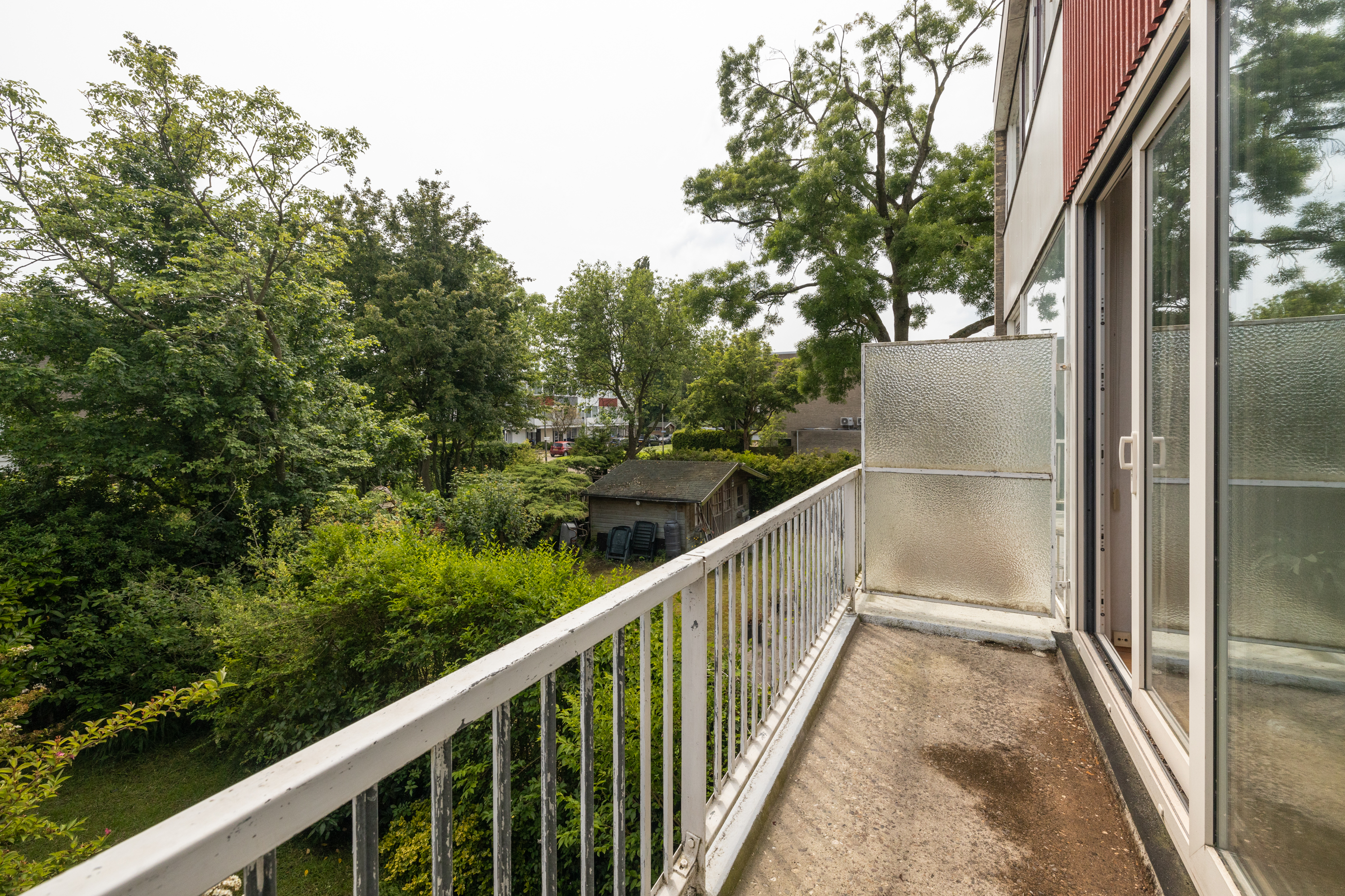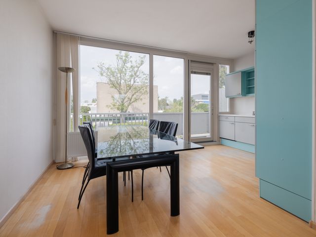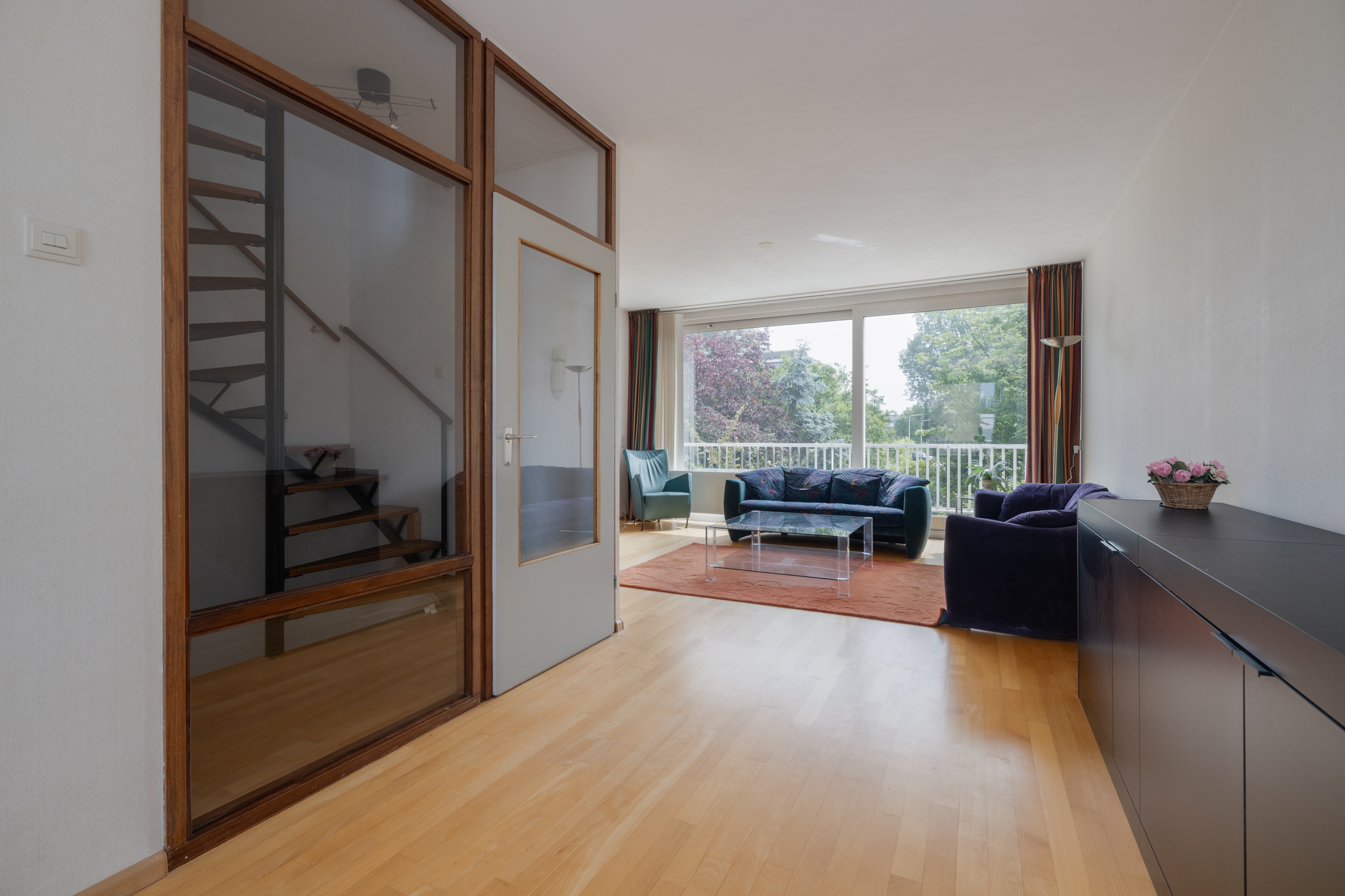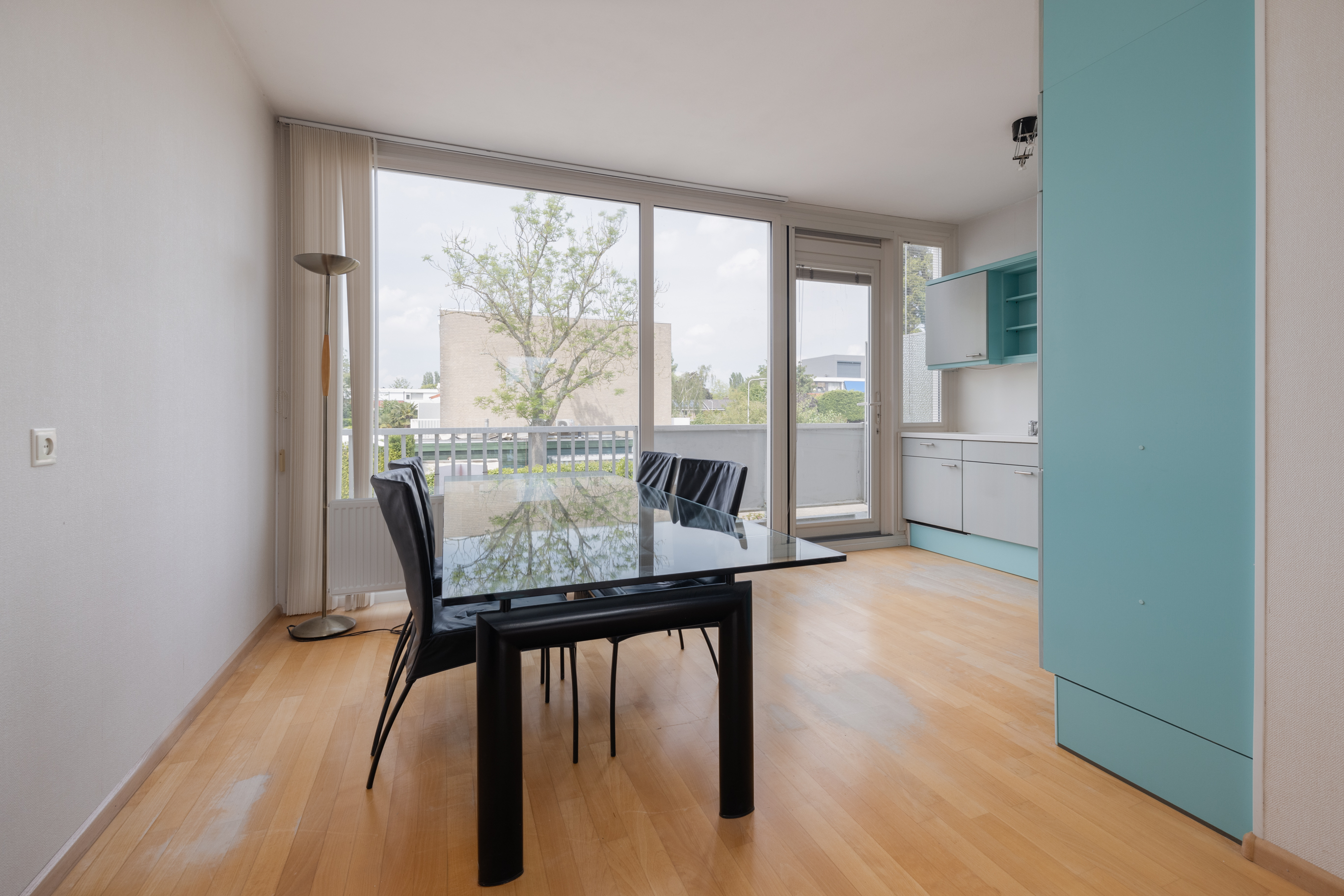 De eethoek bestaat uit een grote rechthoekige tafel met een viertal zwarte stoelen. De woonkamer is gelegen aan de achterzijde en biedt middels een grote schuifpui toegang tot het balkon. Vanaf het balkon prachtig uitzicht over de achtertuin en veel groen! De woonkamer bestaat uit twee zitbanken, twee fauteuils, een vloerkleed, een salontafel en een televisiemeubel.