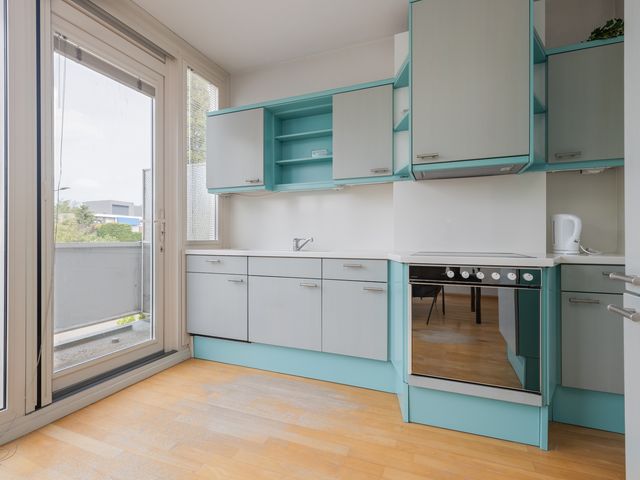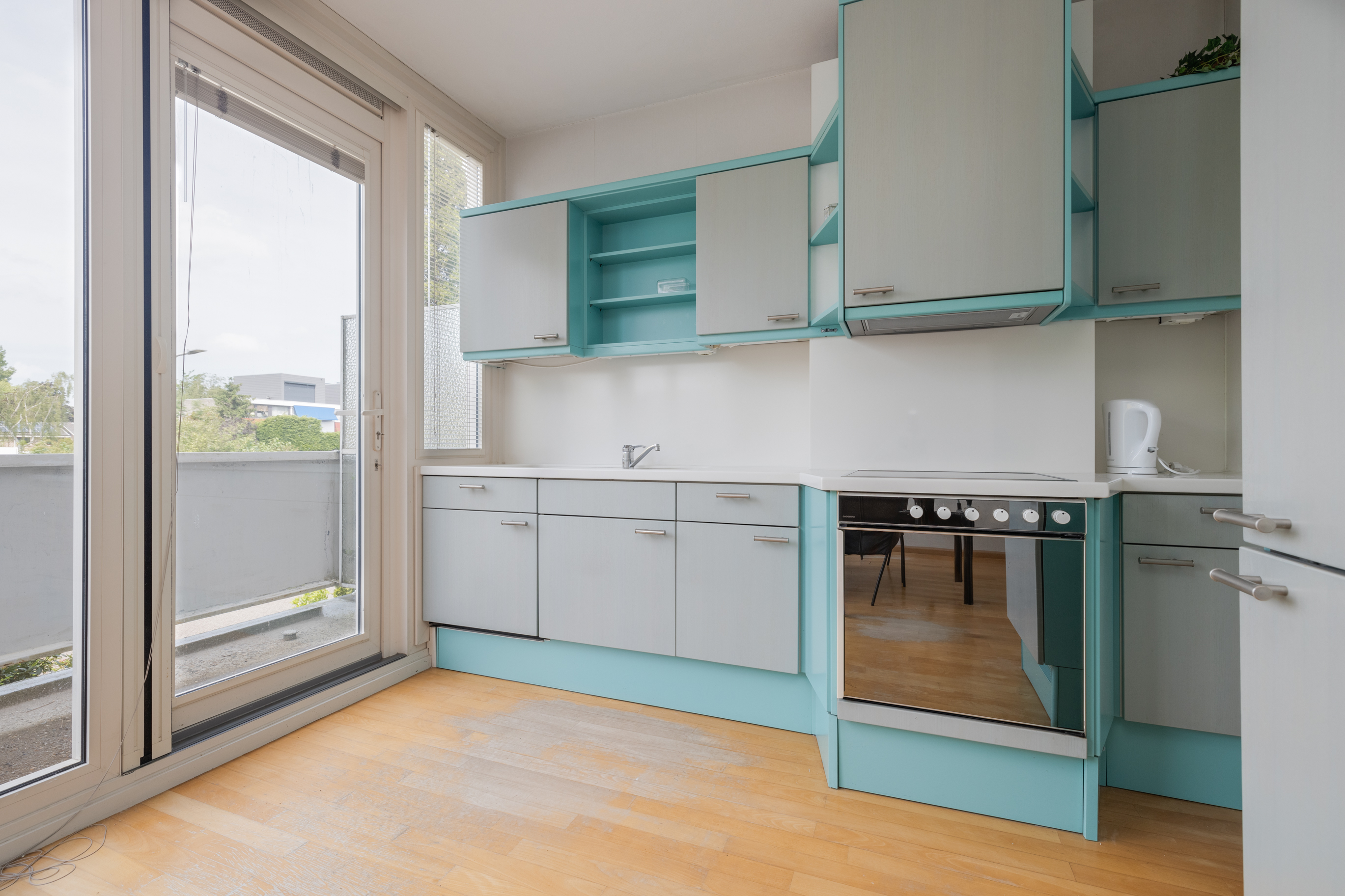 De keuken is gelegen aan de voorzijde van de woning. De keuken is uitgevoerd in grijs en blauwe kastjes met een wit aanrechtblad. De keuken beschikt over een inbouwkoelkast, inductiekookplaat met oven en dubbele spoelbak. Vanuit de keuken toegang tot het balkon middels een deur.