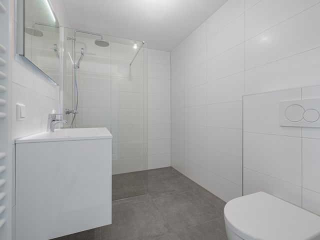 De vernieuwde en luxe badkamer (2024) is volledig betegeld en beschikt over een inloopdouche, wastafelmeubel, 2e toilet en designradiator.