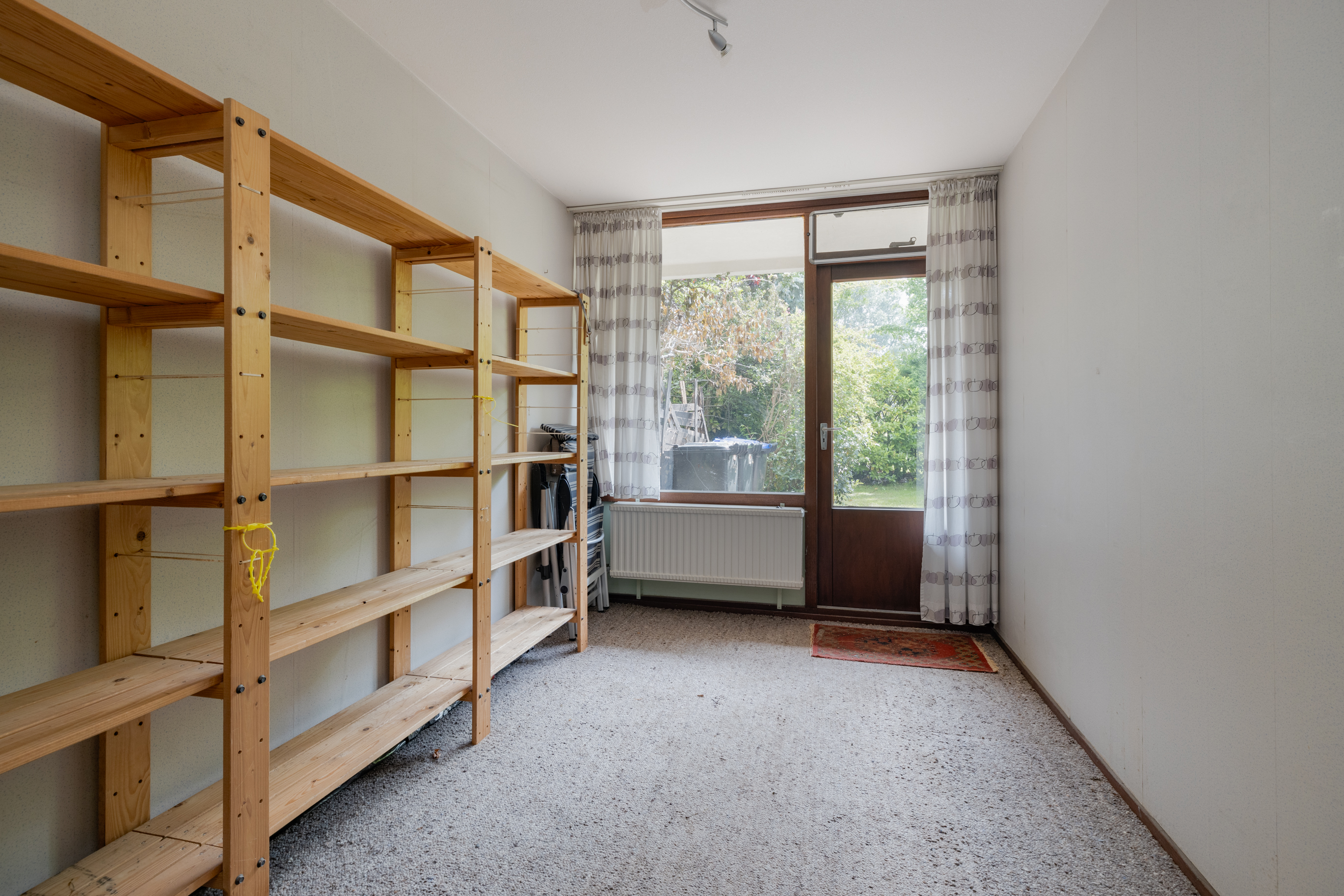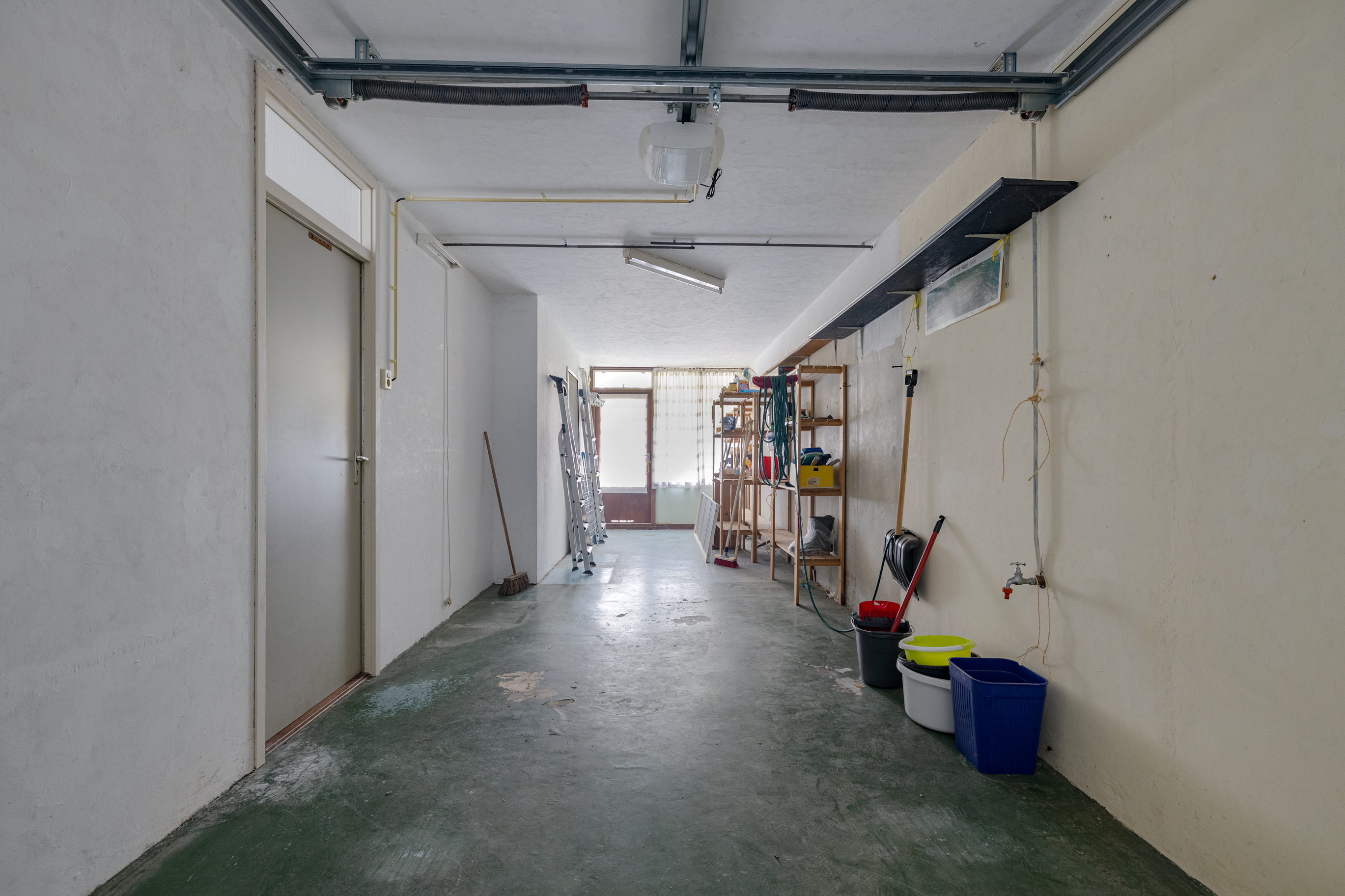 De garage is circa 28 m2 en biedt toegang tot de achtertuin middels een deur. De slaapkamer/tuinkamer is circa 12,8 m2 en biedt eveneens toegang tot de achtertuin middels een deur. De 11 meter diepe achtertuin is gelegen op het zonnige zuidoosten. De tuin beschikt over een betegeld terras en een groot grasveld met veel groen.